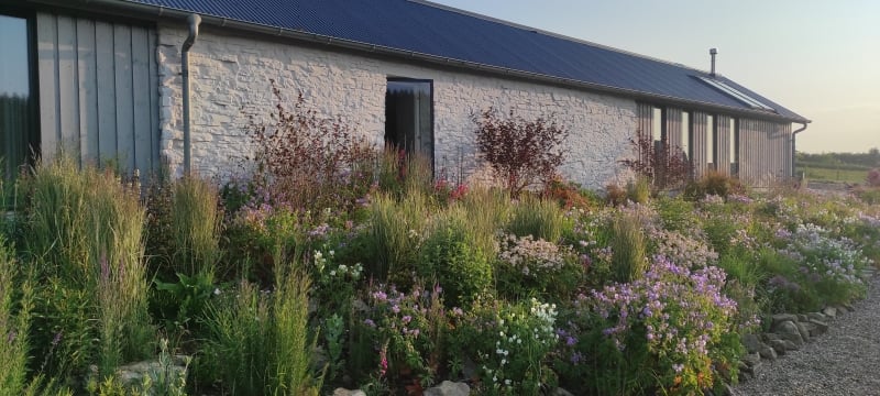 Gwernfyda – A country garden surrounded by fields with pretty views and a small stream running through. At the heart of the ¾ acre garden sits a pretty C16 house and barns. The mix of cottage garden, vegetable garden, stream and naturalistic areas make this a haven for wildlife. Enjoy the sound of the stream, the views and the peace.