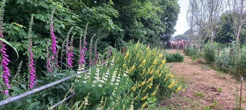 Temple Bar Farm – An interesting garden on a farm. Planting areas wherever space allows! Spring bulbs, bog garden, auricula theatre, foxglove and tree lupin walk, mixed perennial beds and many containers nestling in original farmyard. A herd of rare Ancient Cattle of Wales plus an important Iron Age Fort (Cadw) on the land, with amazing views over three counties, Cardigan Bay, Preseli Mountains and Welsh countryside. Opens 7 and 8 June and By Arrangement.