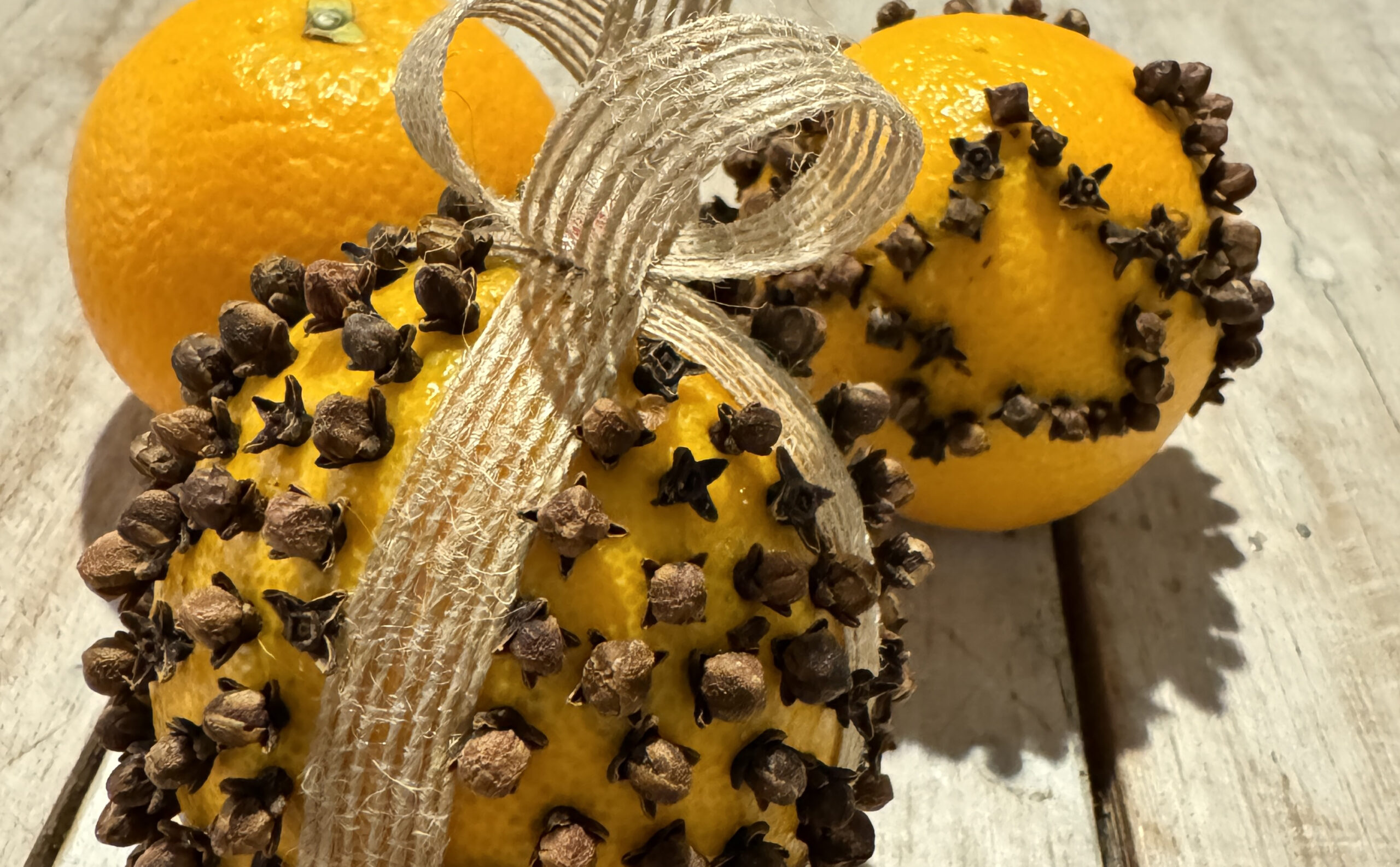 Infuse your home with the scent of Christmas with these easy to make orange and clove pomanders. Choose between covering the whole orange in cloves or create patterns or names, add ribbons of different colours and loops to hang them from your Christmas tree or add to larger decorations or wreaths. (For wreaths you could use small fruit like clementines). Or simply place one or more in each room and let the scent lift your Christmas spirit!