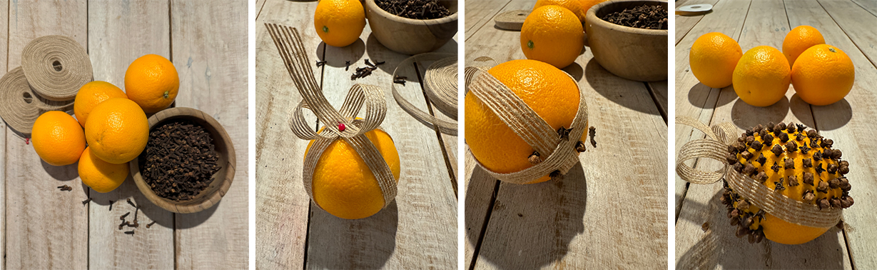 - Start to push the whole cloves into the skin of the orange (enjoy the wonderful perfume of orange and clove as you go!) using the first few to keep the ribbon in place before adding the remaining cloves.