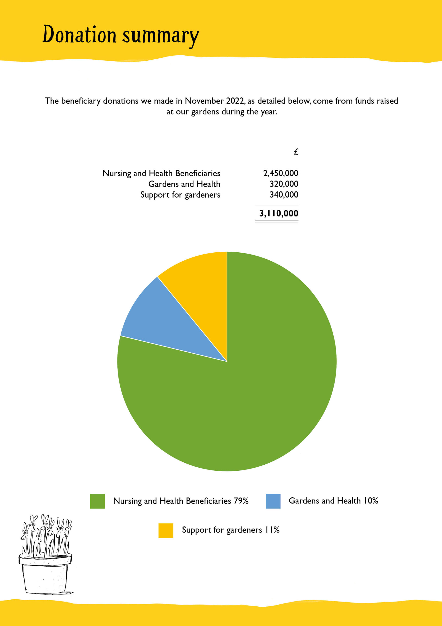 The lion’s share, £2,450,000.00 goes to some of the UK’s best-loved nursing and health charities*, many of which have continued to provide vital support to the NHS and communities across the UK in the wake of the COVID-19 pandemic and who are now struggling to provide services in the new cost of living crisis. The long-term nature of funding from the National Garden Scheme allows these charities to continue the provision of critical community nursing services, end-of-life care and respite for families and carers.