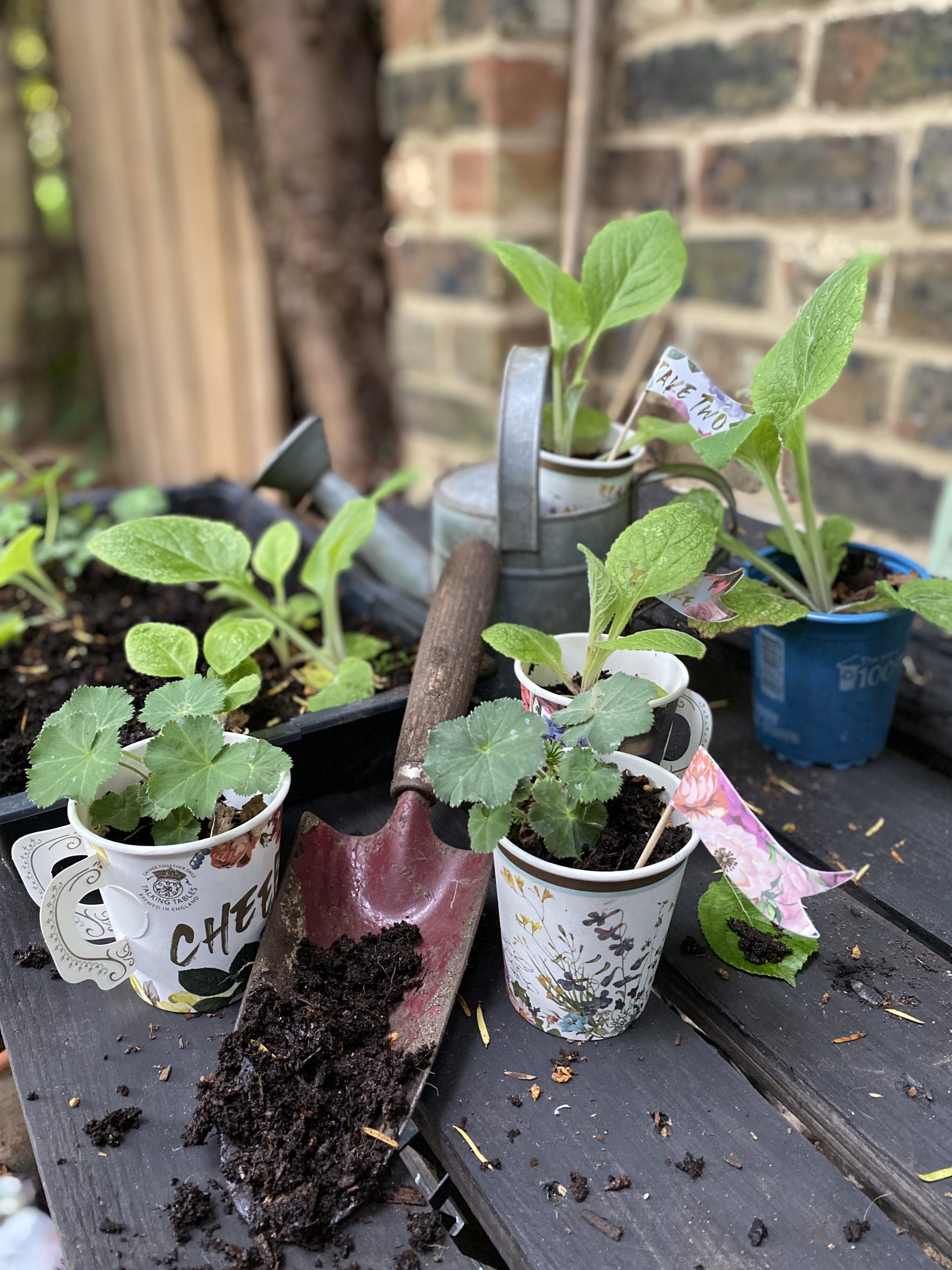 Start by poking a few holes into the bottom of your paper cup for drainage. Add in the soil, then the seed or seedling of your choice. Top up with some more soil and then water. And don’t forget to label – we reused our Truly Scrumptious food flags.