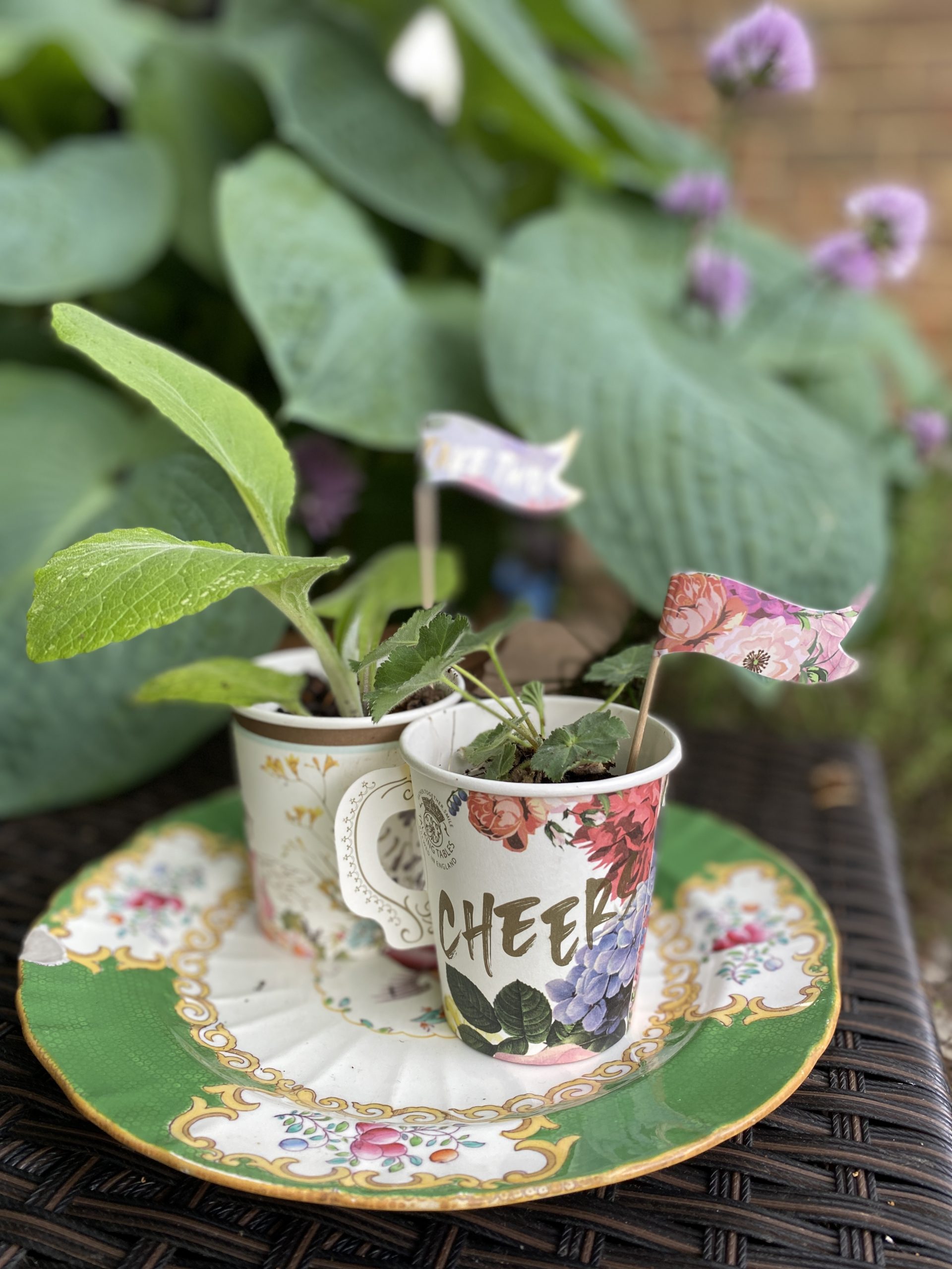 Here we are using the Talking Tables ‘Truly Scrumptious’ range paper cups. As our 2022 event sponsor, Talking Tables will be donating 5% of sales from the Truly Scrumptious range to the National Garden Scheme. It’s a great way to decorate your Great British Garden Party whilst supporting some of the UK’s best-loved nursing and health charities – and using them afterwards in the garden is the icing on the cake!