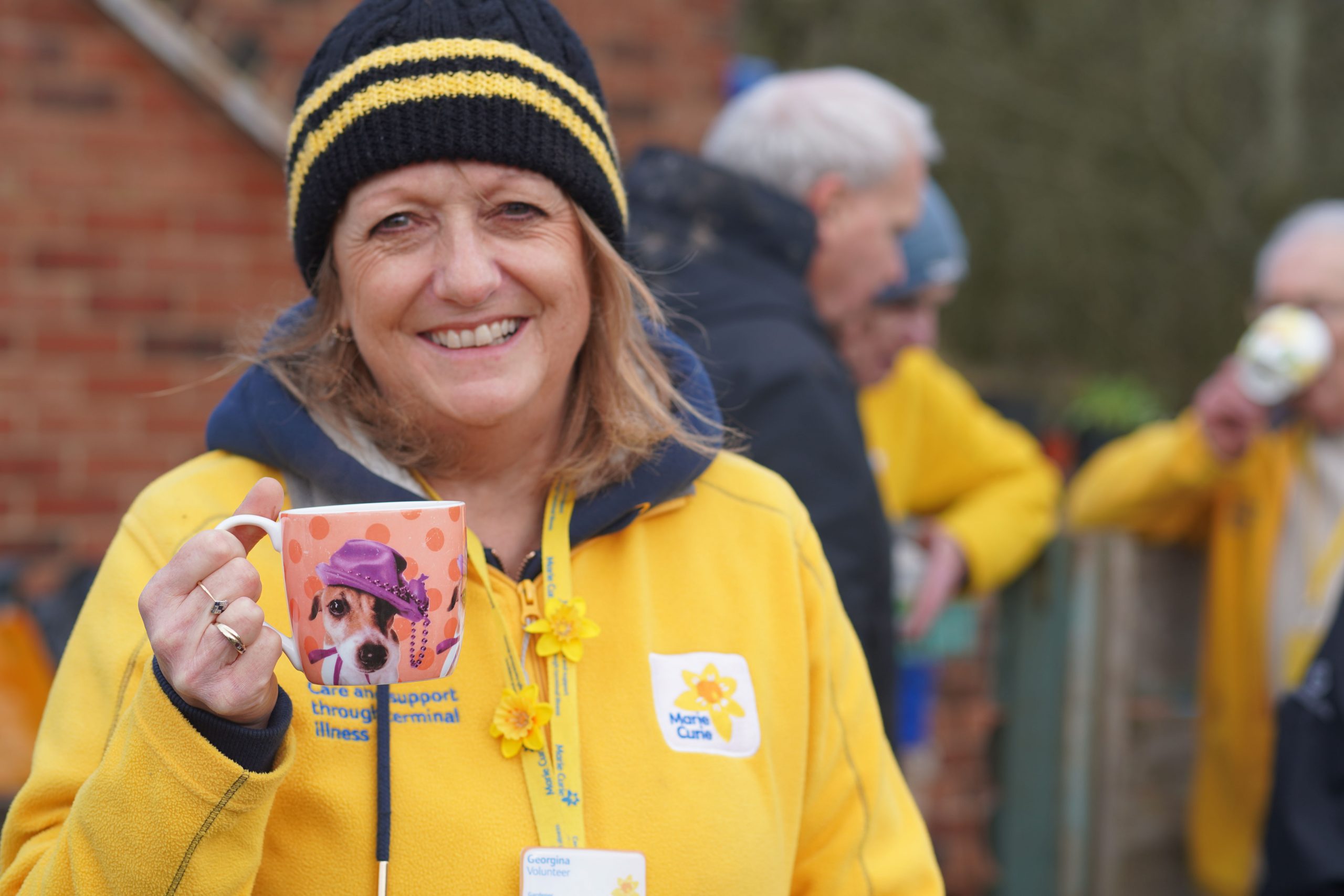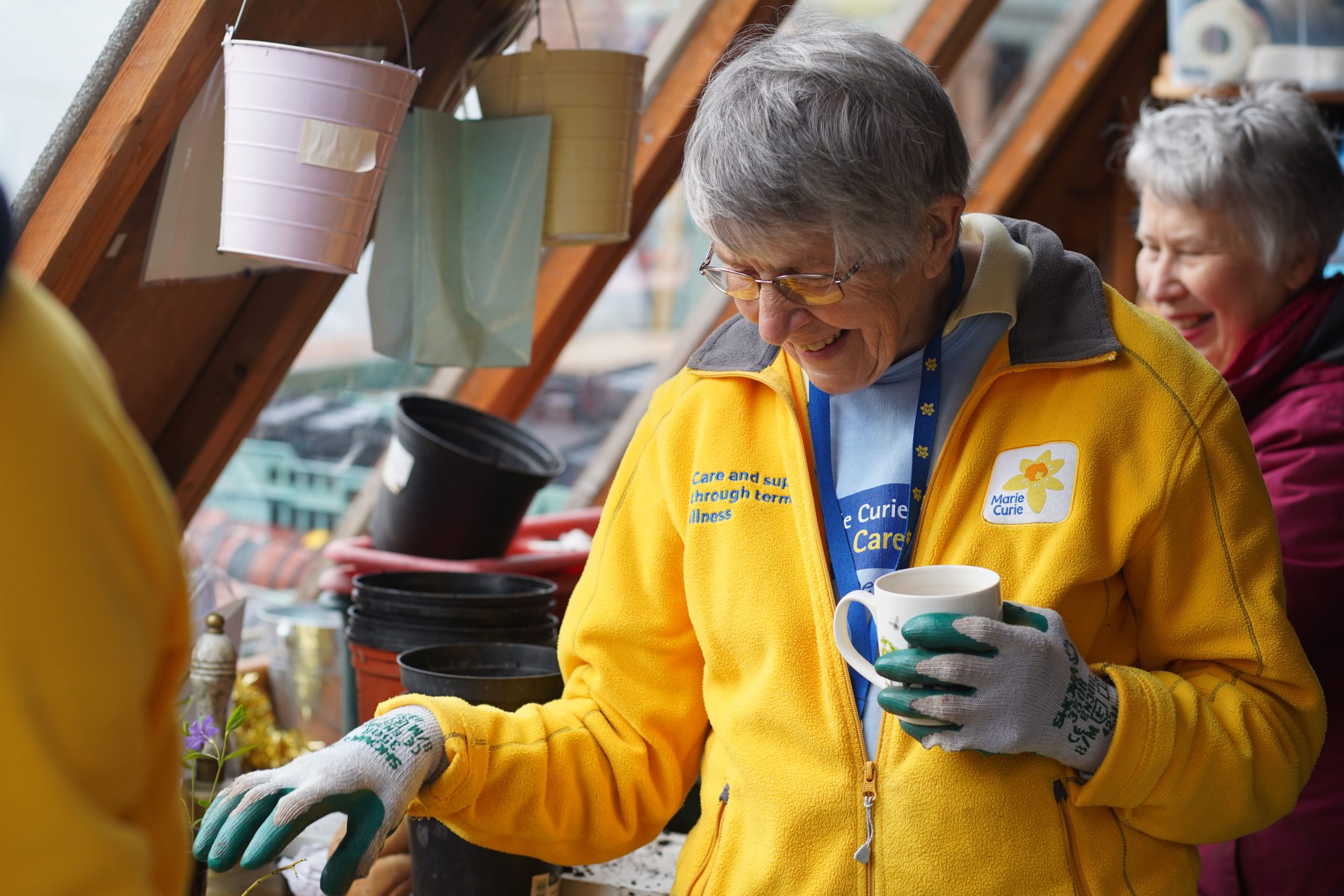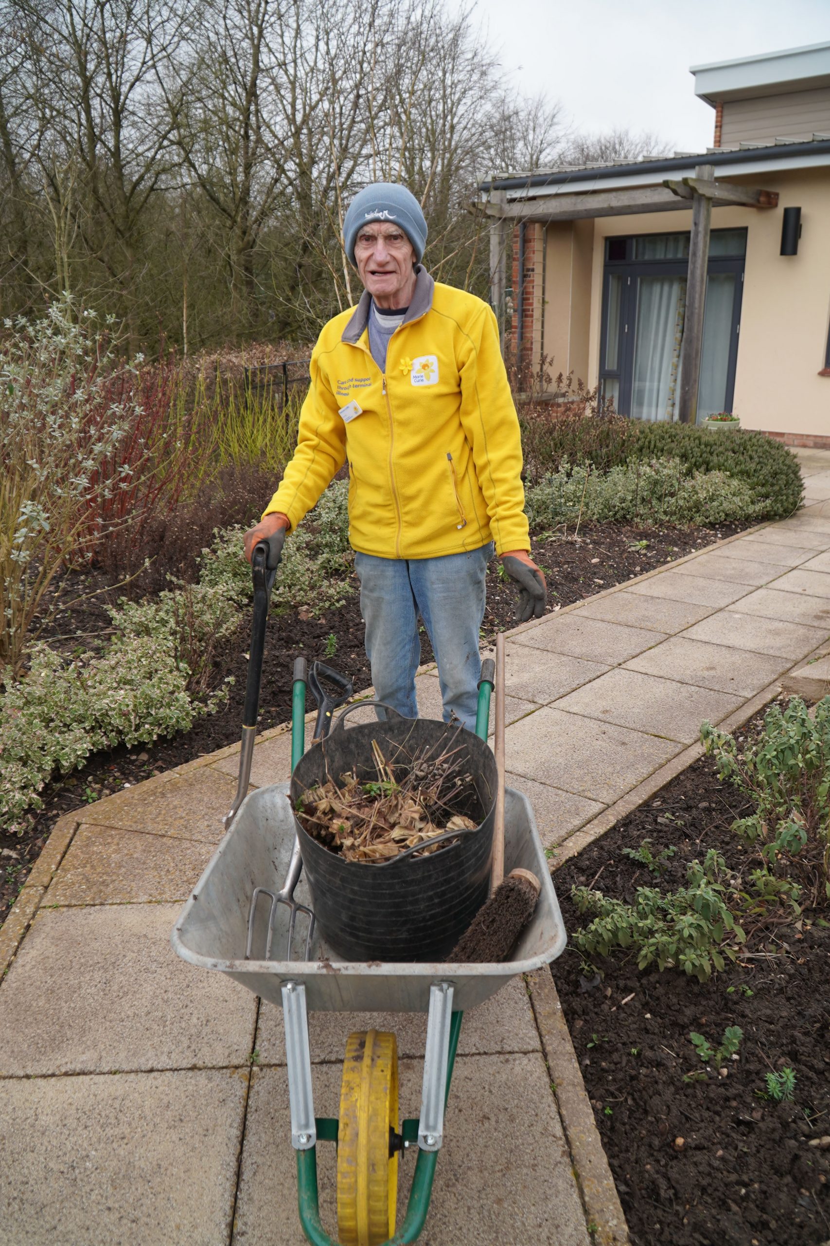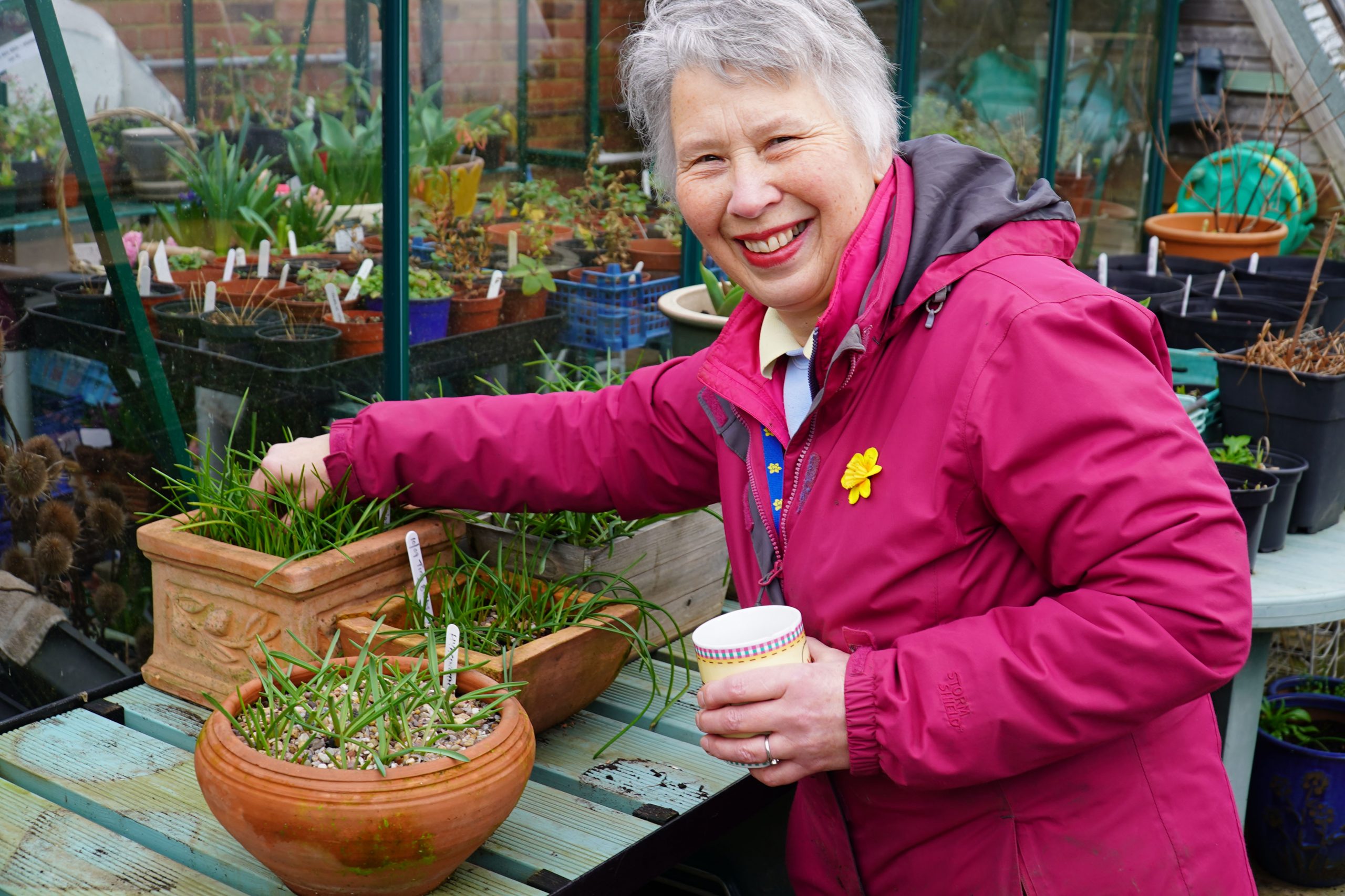 So far, there’d been little sign of the volunteers that I’d come to meet but in the furthest corner of the garden among the poly tunnels and potting sheds we could hear a hubbub of voices, the ring of laughter. It was break time and 18 gardeners, men and women, young and old, some in Marie Curie sunshine yellow, all dressed against the cold, were cradling hot cups of tea and coffee, sharing cakes and chatting. Their welcome was warm and their eagerness to share stories of what they do and the garden they tend was infectious.