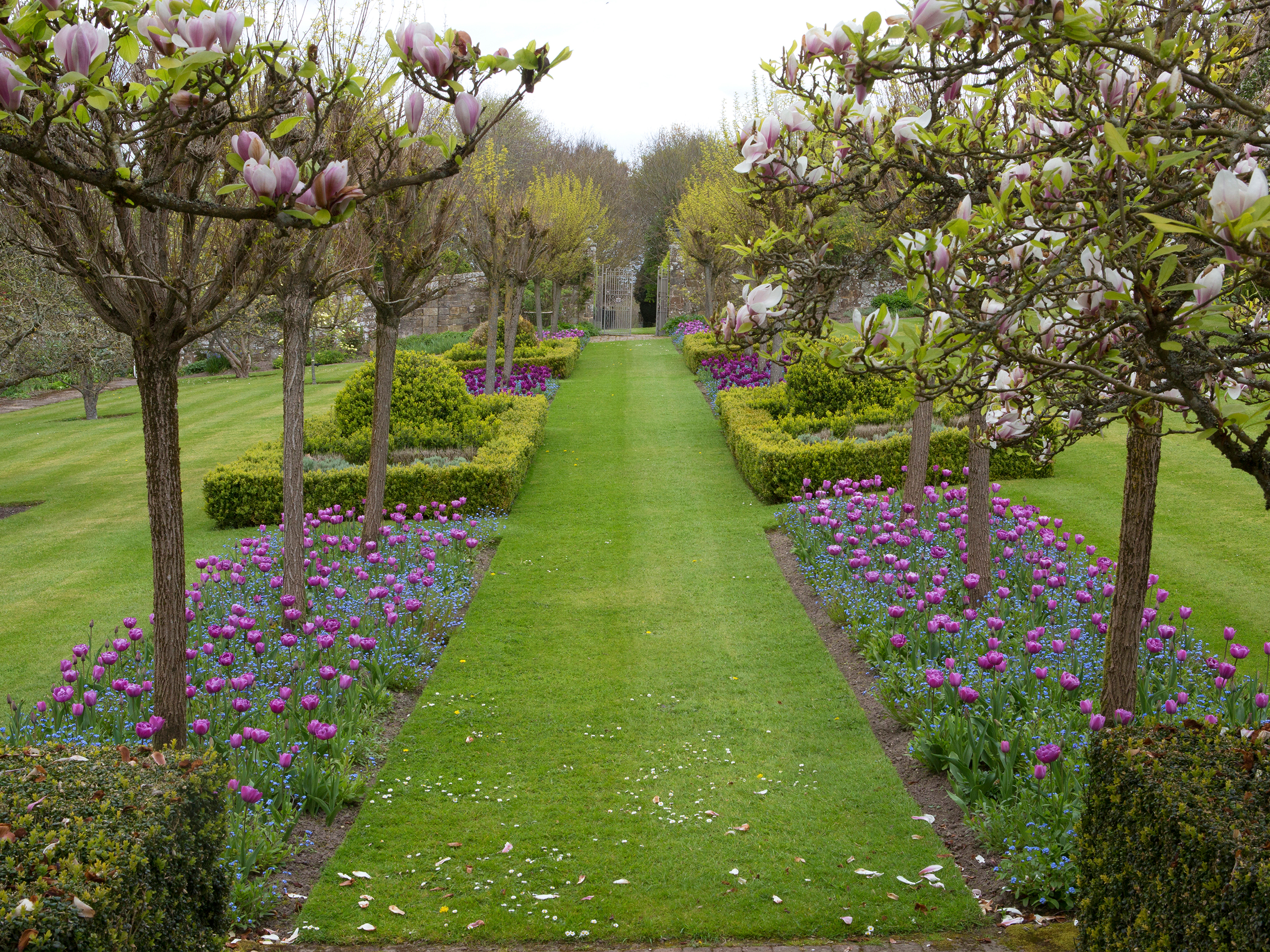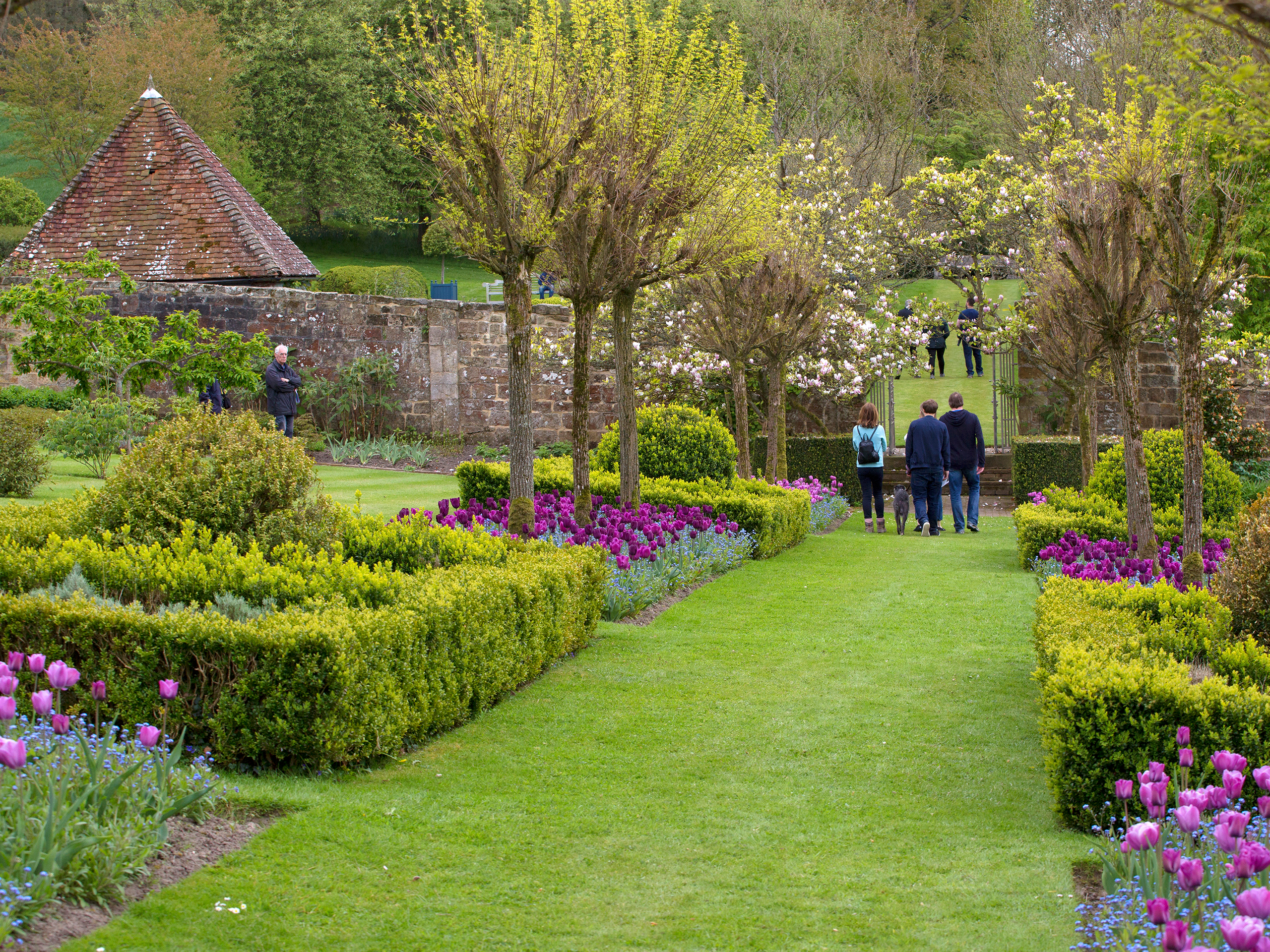 The poet Dorothy Wellesley lived here during the 1920s and the 18th century Temple of Friendship recalls her occupation. Lord and Lady Gibson were helped by their friend the distinguished post-war designer Lanning Roper, whose advice brought some of the plant combinations in the borders and the ornamental varieties in the woodland. At this time of year an avenue of crab apples us underplanted with tulips and in the woodland sweeps of daffodils are followed by bluebells and the native trees are decorated with the rich colours of azaleas, magnolias and other ornamental trees and shrubs.