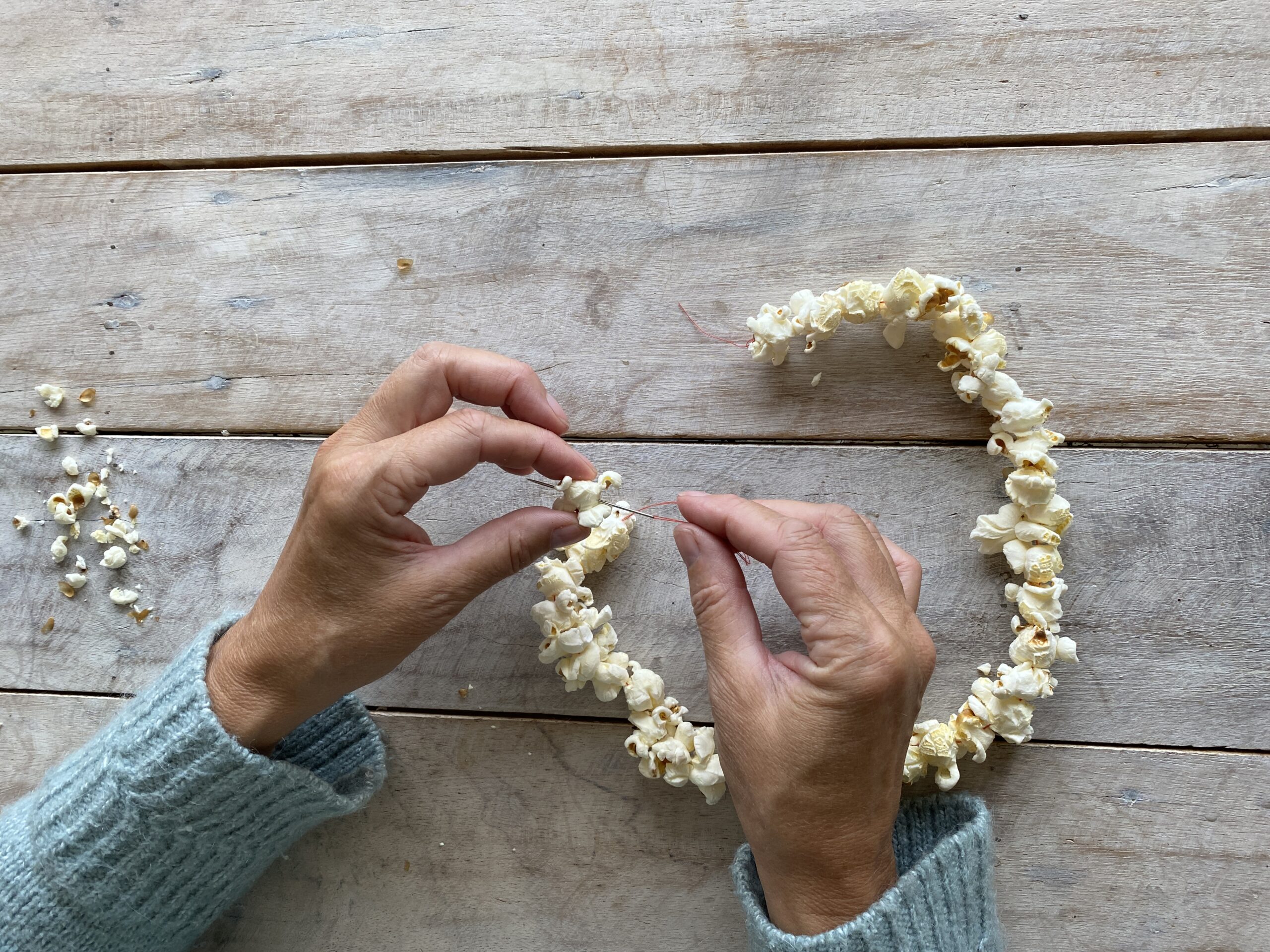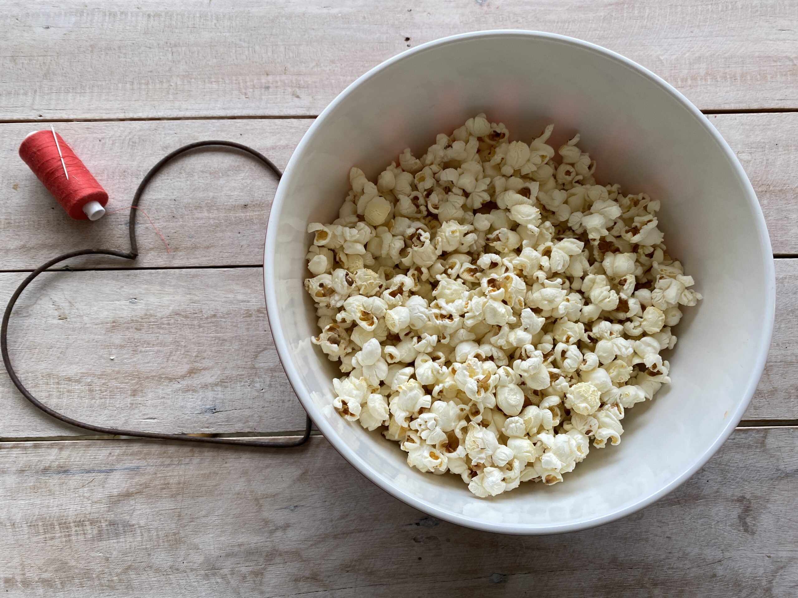 Threading popcorn onto thick cotton using a large needle is the easiest way to create long swags of popcorn to hang on a tree – inside or outside. You can add cranberries or rose hips to add colour.