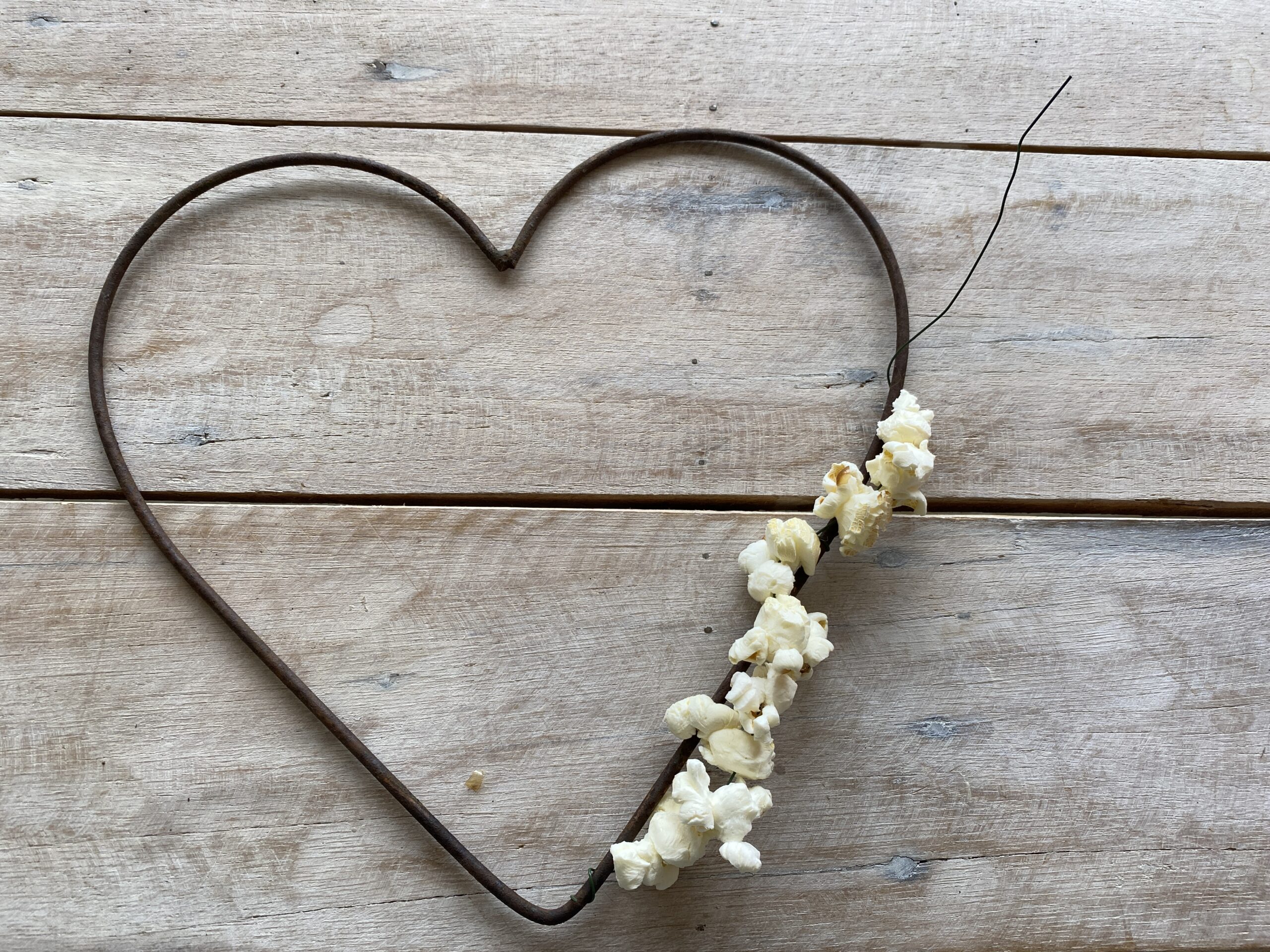 We had a metal heart shape but you could use a metal coat hanger to create a heart or round shape using the hook to hang your wreath. Using florist wires we threaded the popcorn and attached it to the metal shape, weaving it round the shape. It can be quite fiddly but the result is effective.