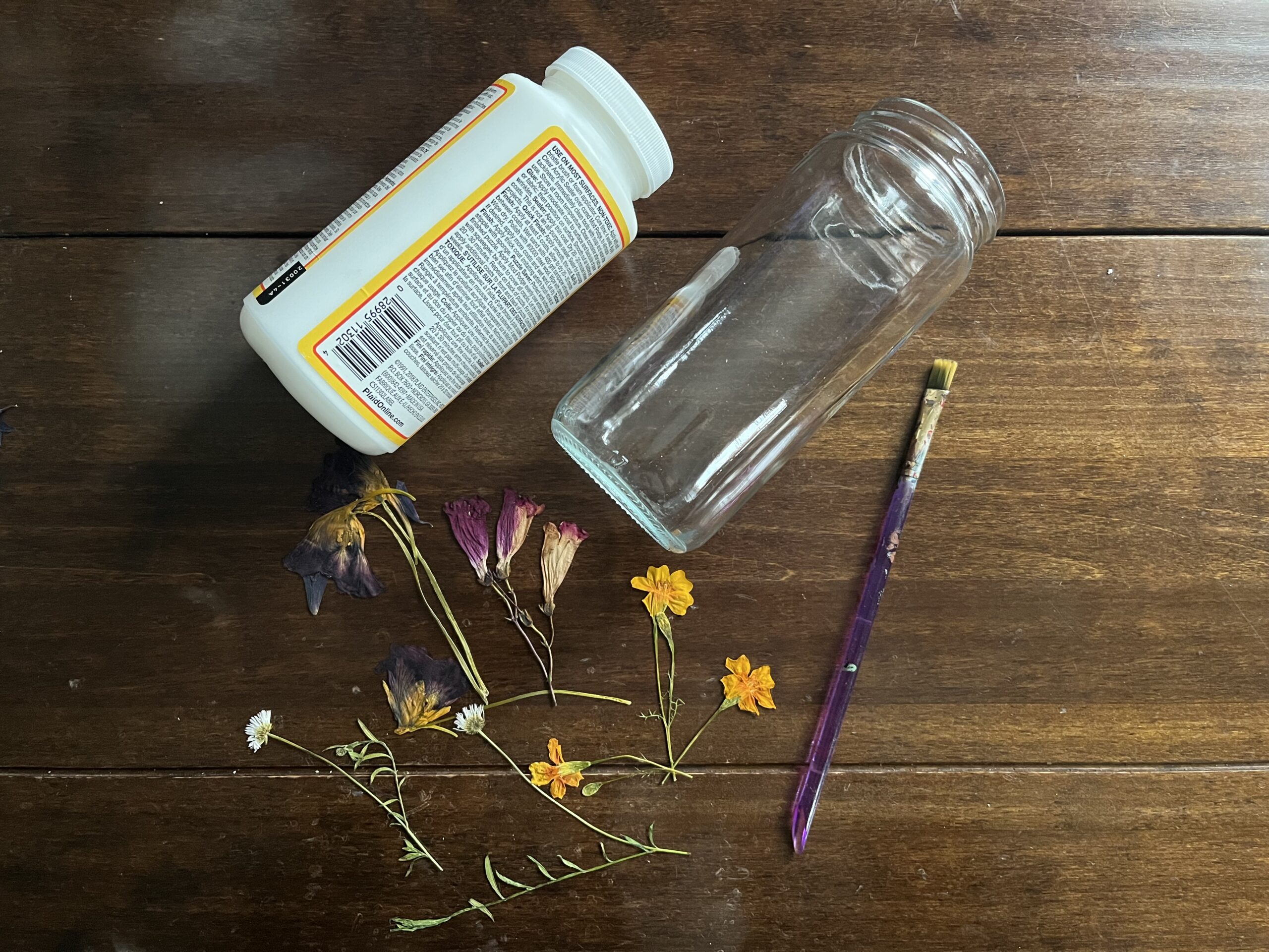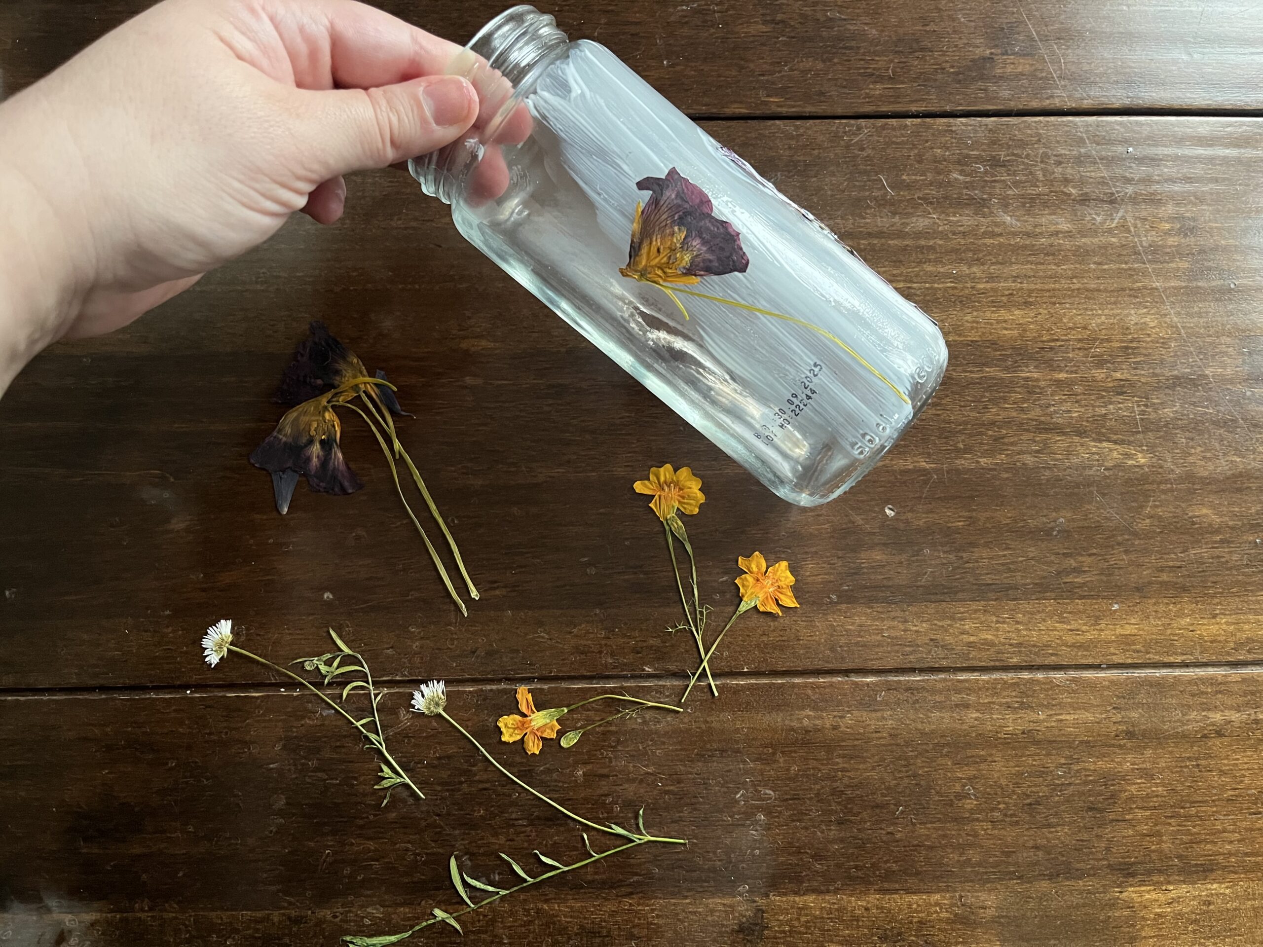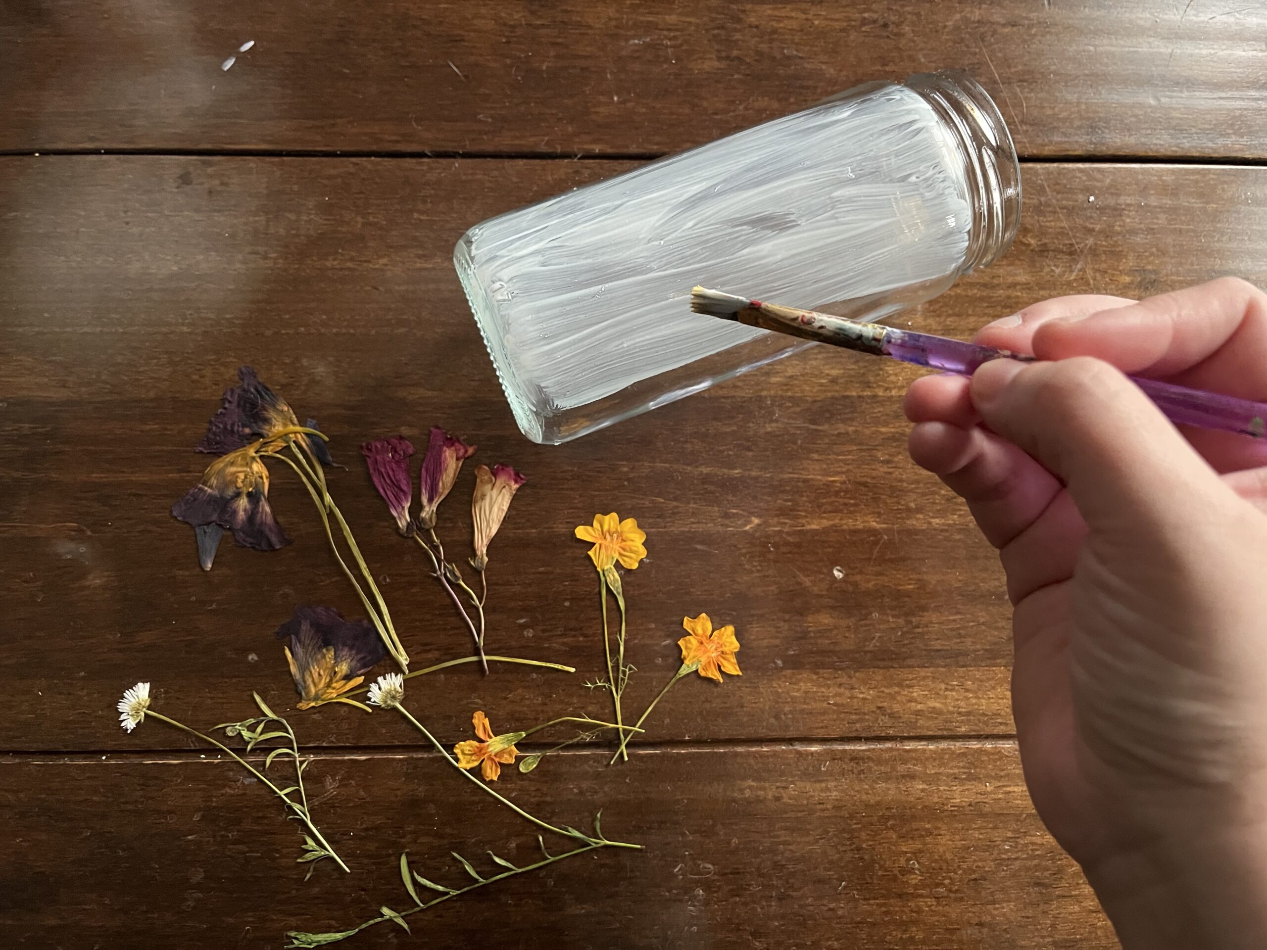 Place your flowers or leaves where you want them so be on the jar, they will be delicate so once they are down try not to fiddle with the design!