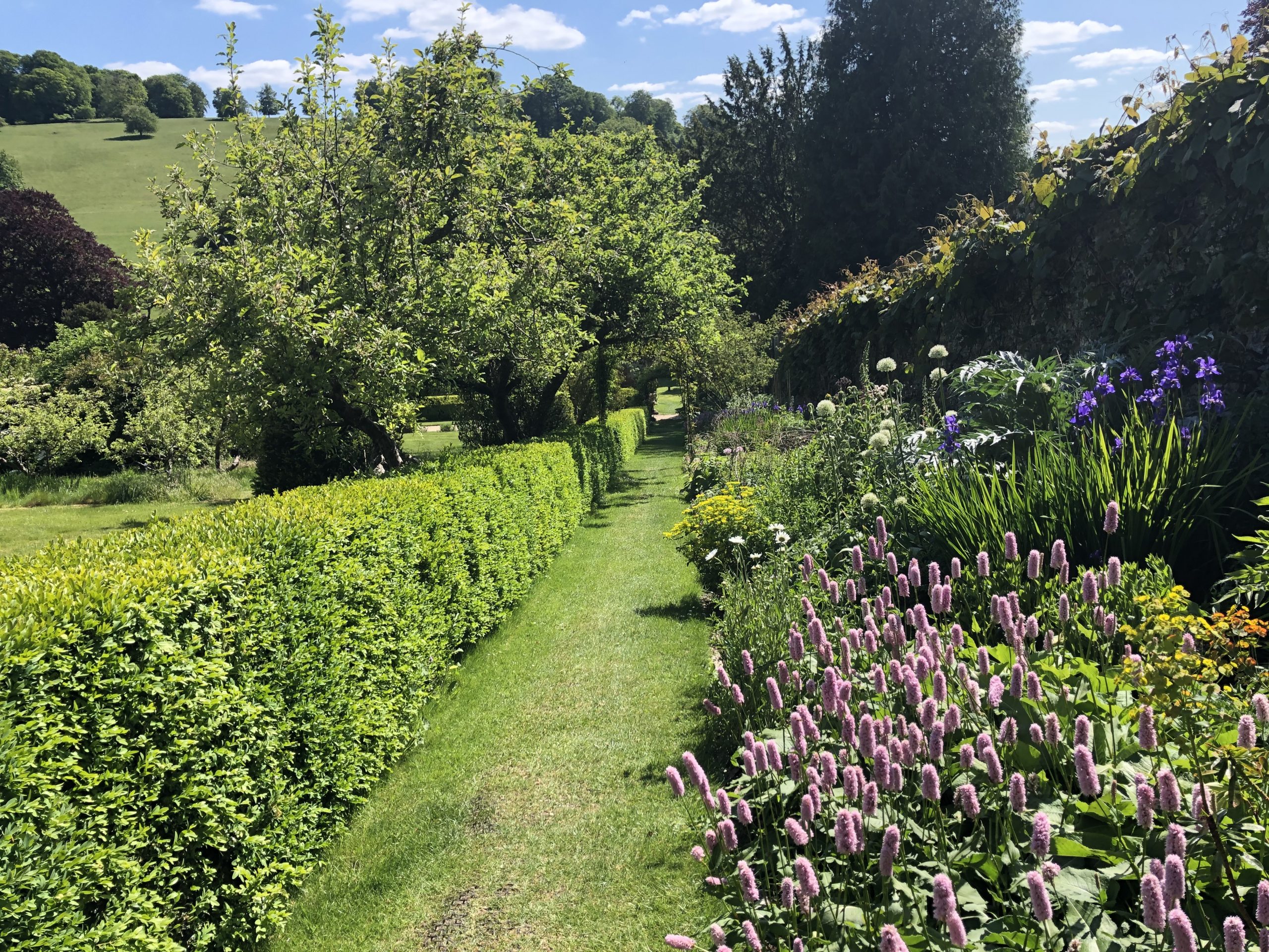 The five-acre garden combines spectacular south facing herbaceous borders that thrive from spring through to early autumn with a succession of bulbs, tulips, roses perennials, annuals, late flowering salvias, penstemons and dahlias. The terraced garden is sheltered by red brick walls that host climbing roses and tender shrubs, vines and clematis while in the woodland garden, rambling roses scale the Douglas firs planted one hundred years ago. There is a box edged rose parterre, laid out in 1867 which now contains a mix of old varieties and new English roses, underplanted with cosmos and nicotianas. The acid soil is ideal for the banks of blue hydrangeas that flower from August through the autumn, while the inner courtyard is planted with lime green paniculata and Annabel hydrangeas.