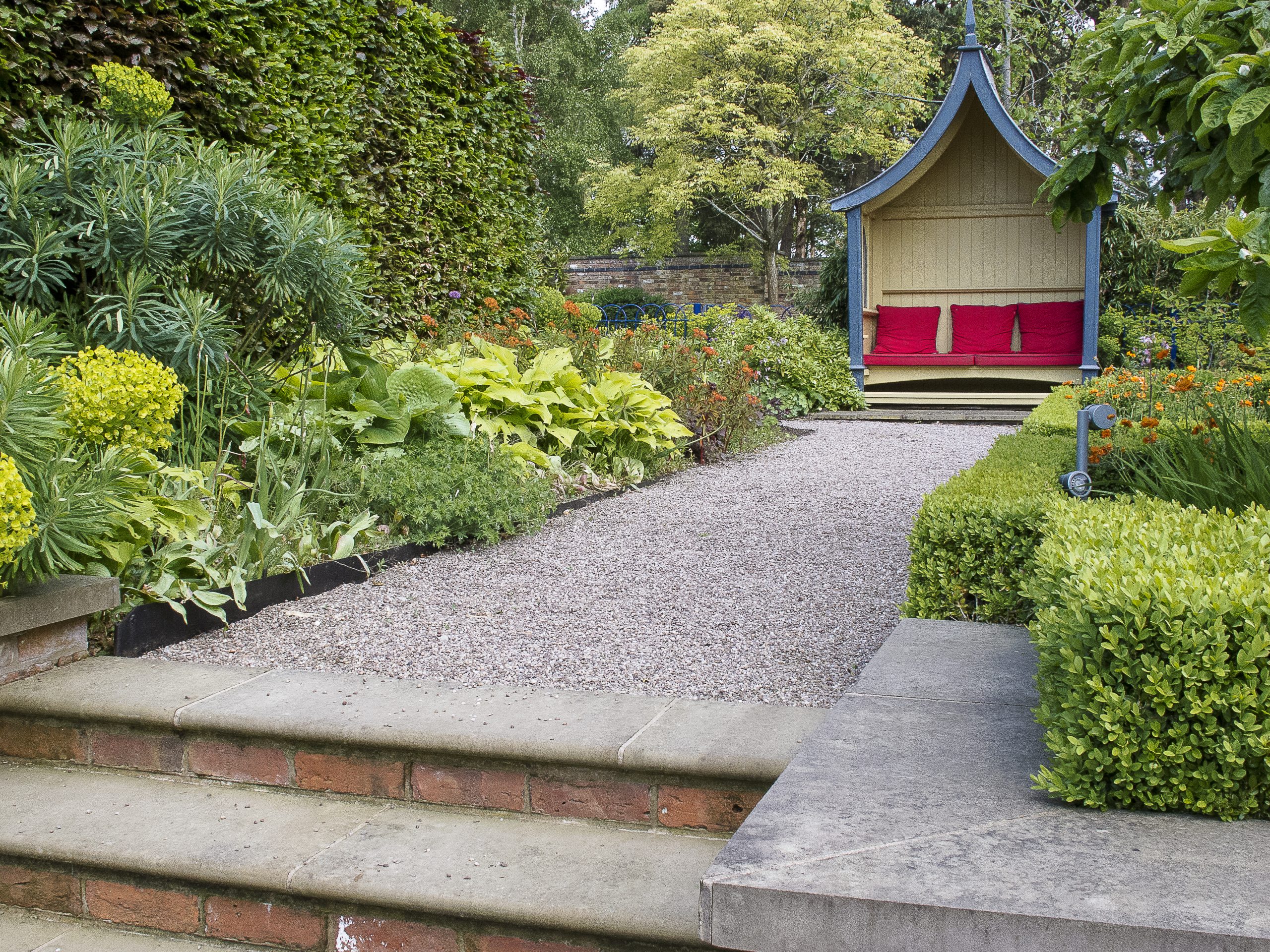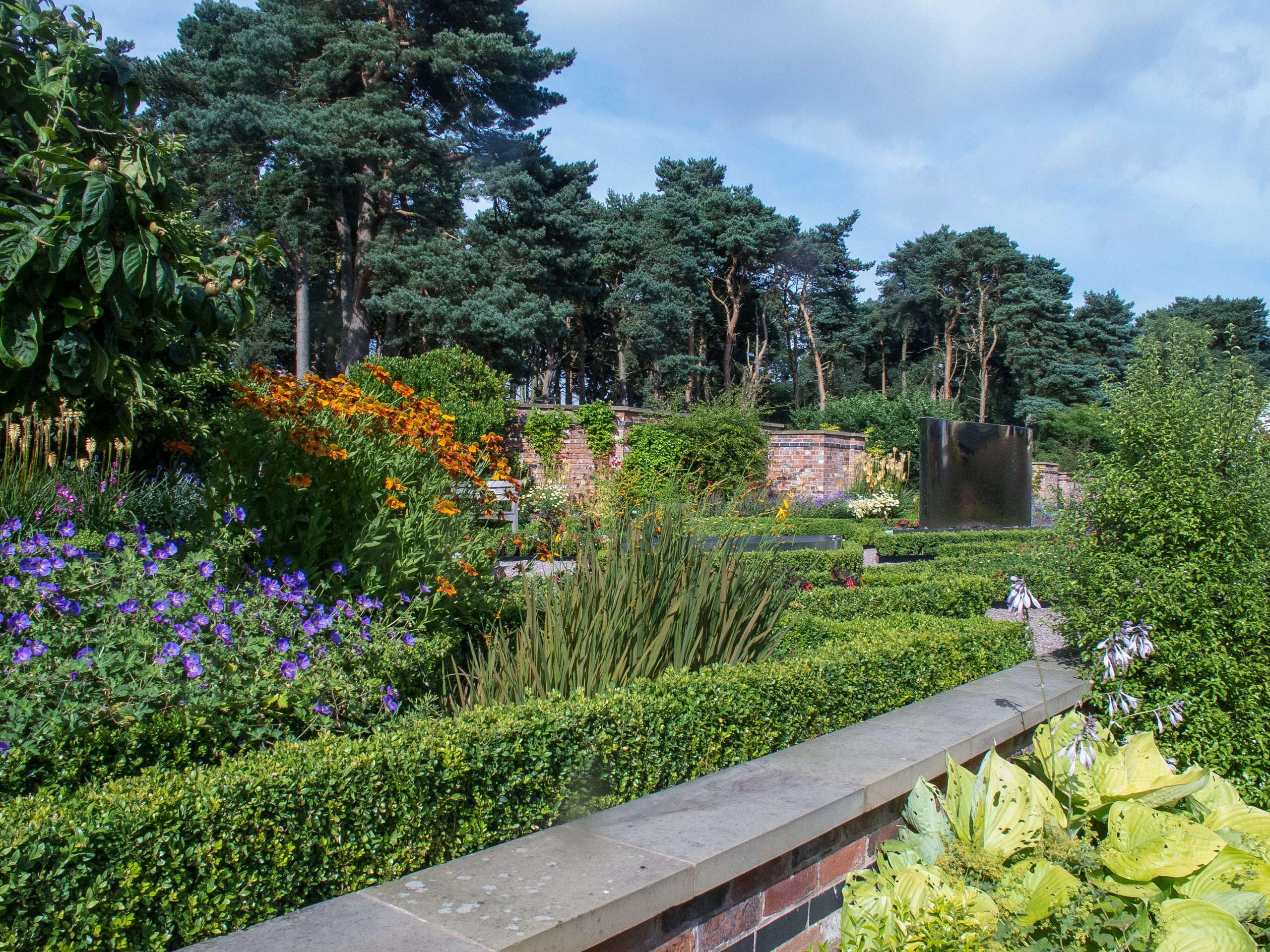 Sixteen landscaped acres of beautiful Cheshire countryside with terraces, walled garden, extensive woodland walks and an amazing hosta garden. Turn each corner and you find another gem with lots of different water features including a new rill built in 2014, which links the main lawn to the hostas.