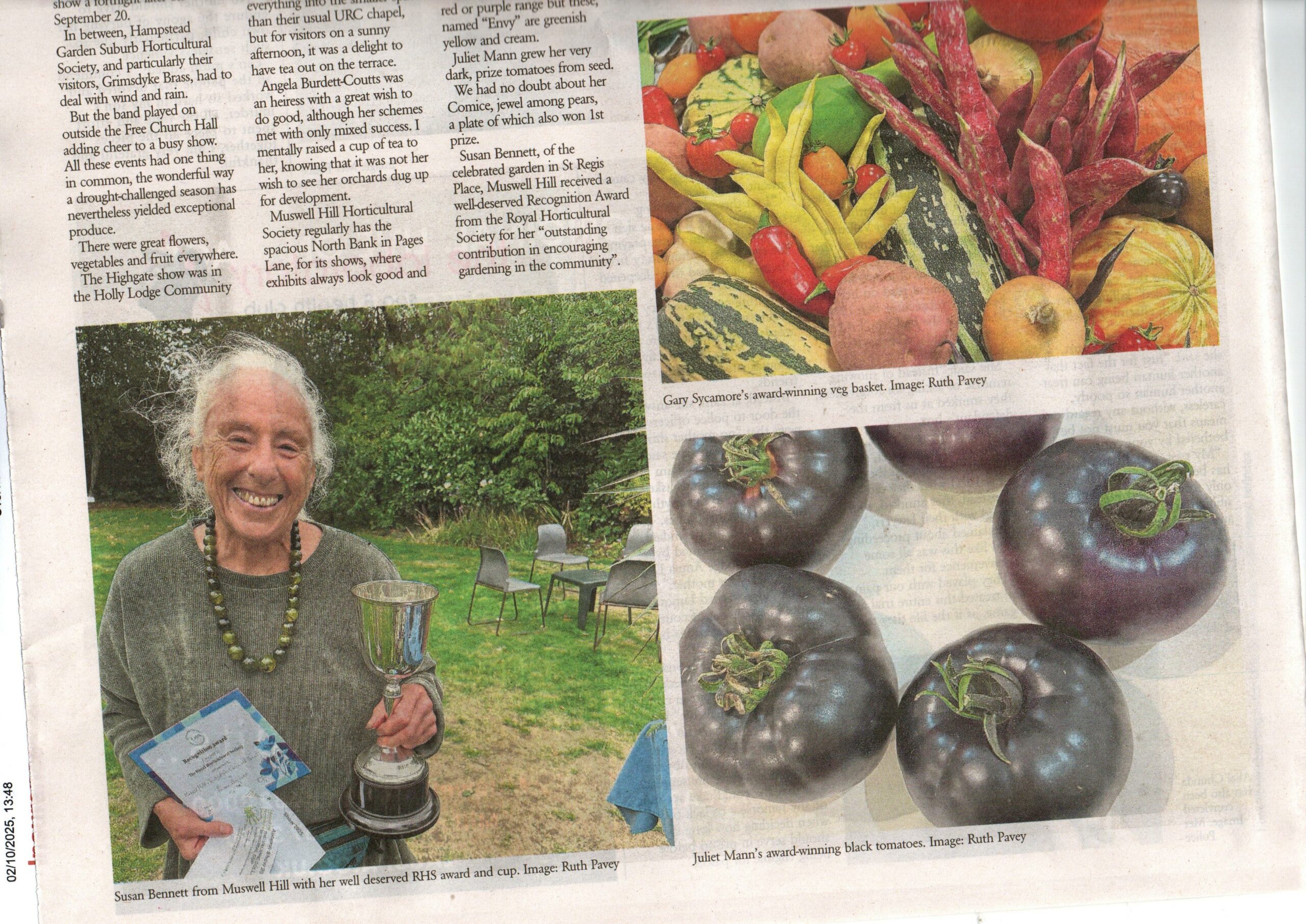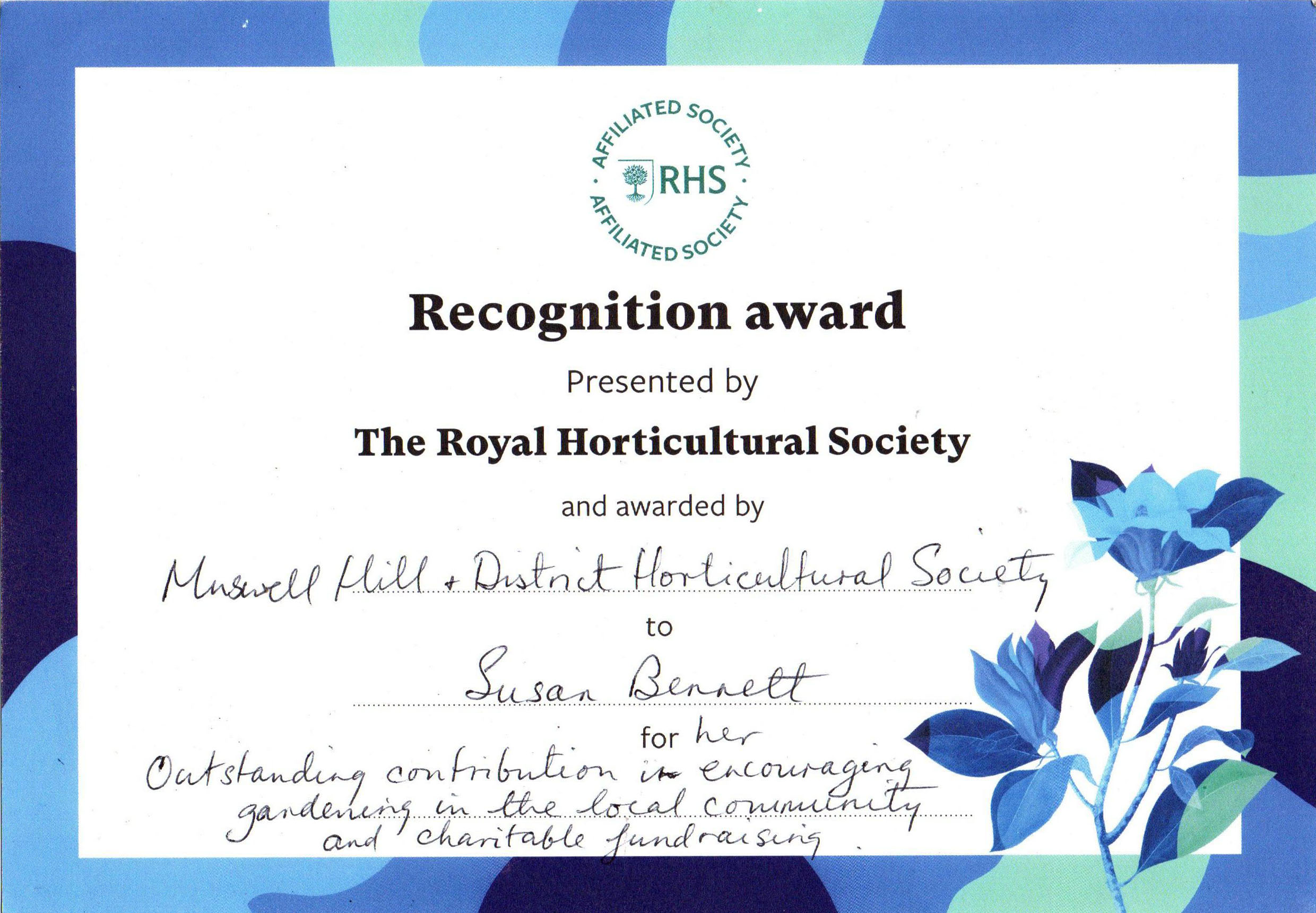 Susan says: ‘I was totally surprised to receive a certificate from the RHS from the Mayor as well as a cup and other prizes at our Horticultural Show…life is full of surprises!’