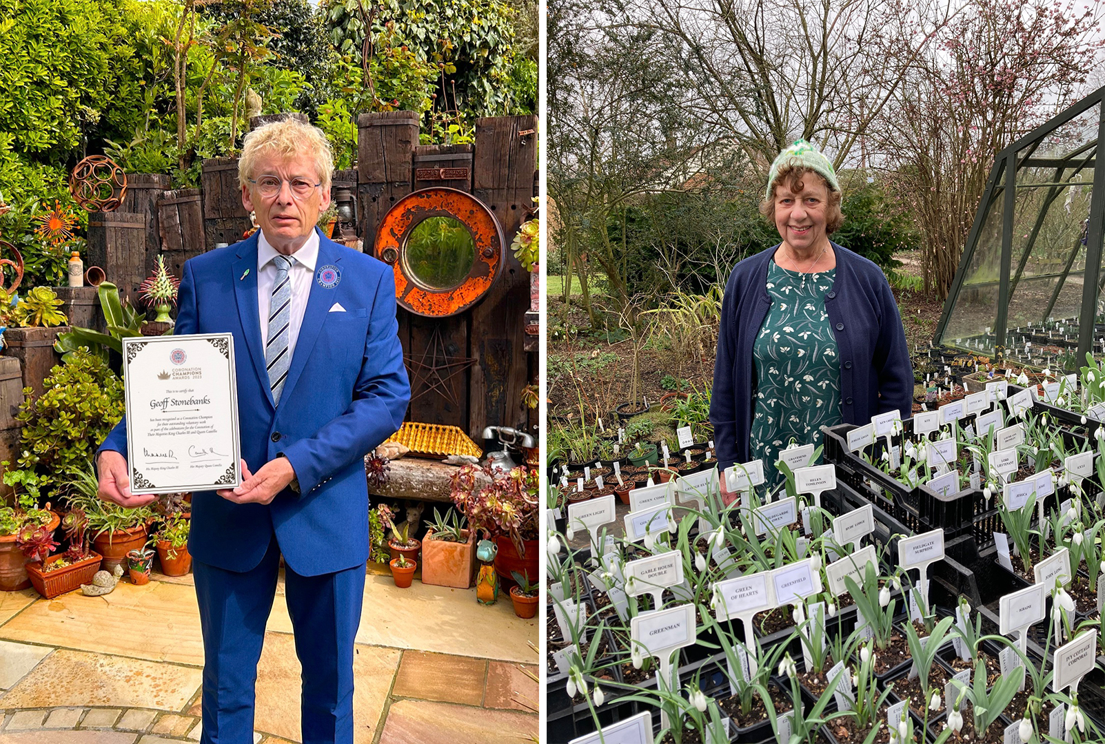 - Geoff in his garden dressed ready for the Royal Garden Party and Brenda with some of her fabulous snowdrops
