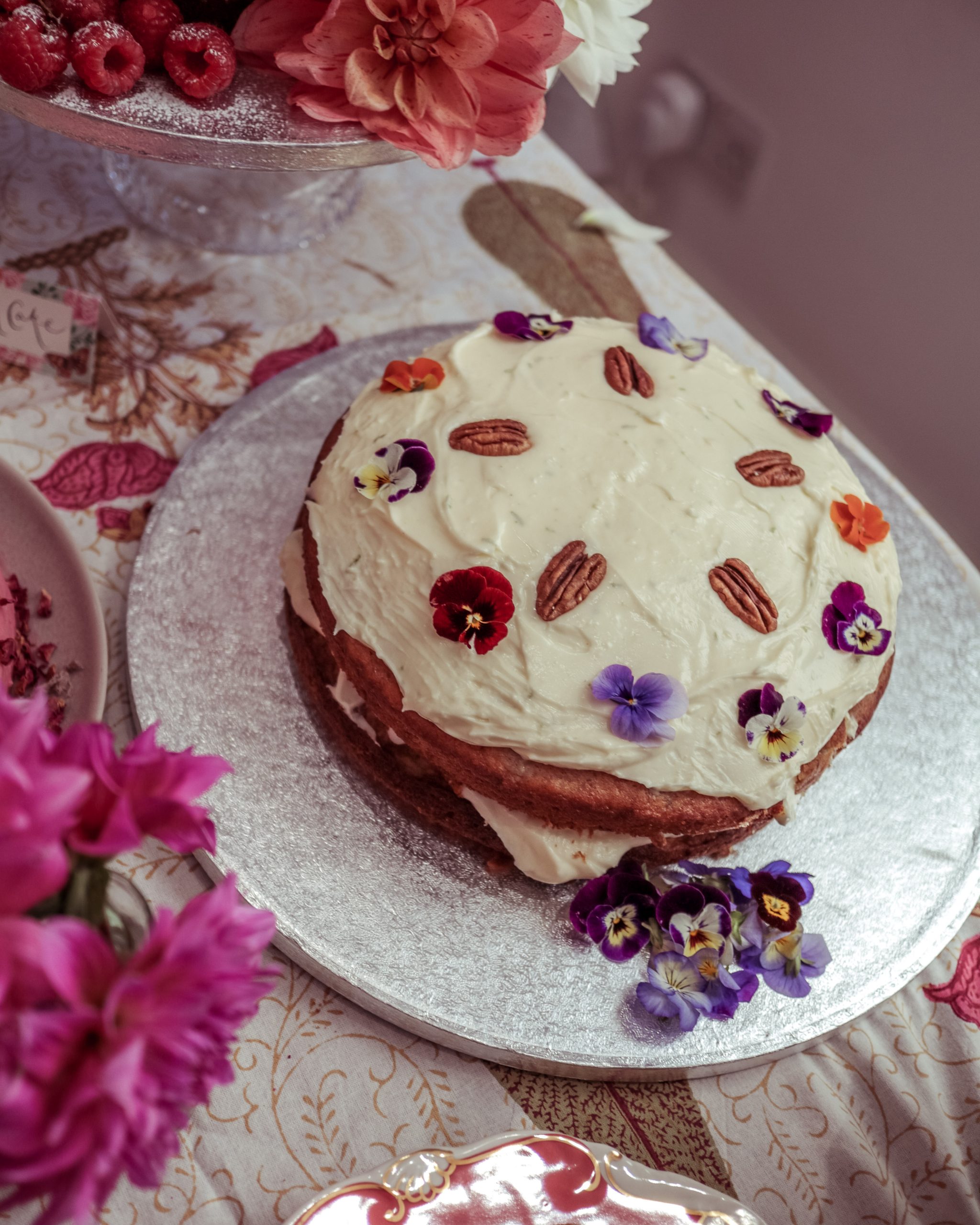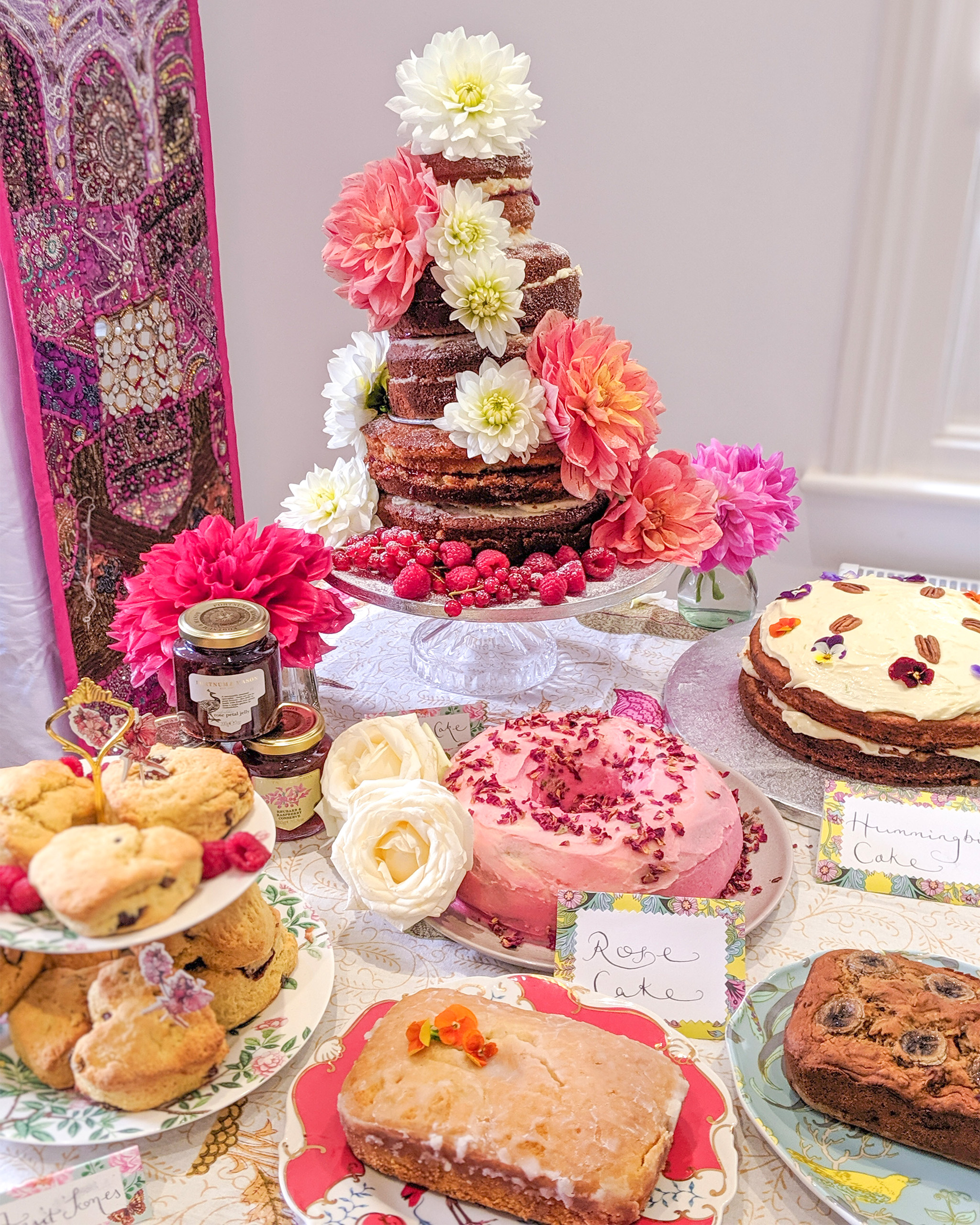 “Every year at the garden opening I find it’s either the classic cakes or the mega showpieces that go down the best. Lemon drizzle always sells out first, and that’s one of the easiest to make! The towering dahlia cake is striking – layers of Victoria sponge piled high with dahlias and berries to adorn the layers. One of my favourite new things to serve this year is classic biscuits – either with marbled royal icing (just dip them in, no precision needed!) or edible flowers like this TikTok video shows…”