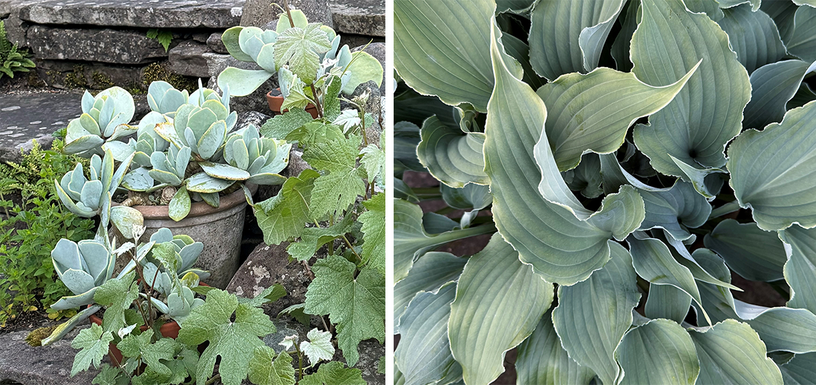 Plants still to flower seem to be biding their time, dry-rooted. All the phlox, thank goodness, are waiting for rain to open and fill the air with that peppery scent (phlox and regale lilies follow on from a dozen philadelphus and as many Elaeagnus ‘Quicksilver’; I like the garden properly invaded with perfume, not squirted). The pink red-twigged ceanothus ‘Marie Simon’ (yes, pink) looks totally at ease in the heat, which I guess is what you’d expect from a Californian, and up and down the front steps dozens of mealy-white pigs’ ears (Cotyledon orbiculare) lie back and smile as rogue stems of the dusty-miller grape vine (Vitis vinifera ‘Incana’) tickle their underbellies.