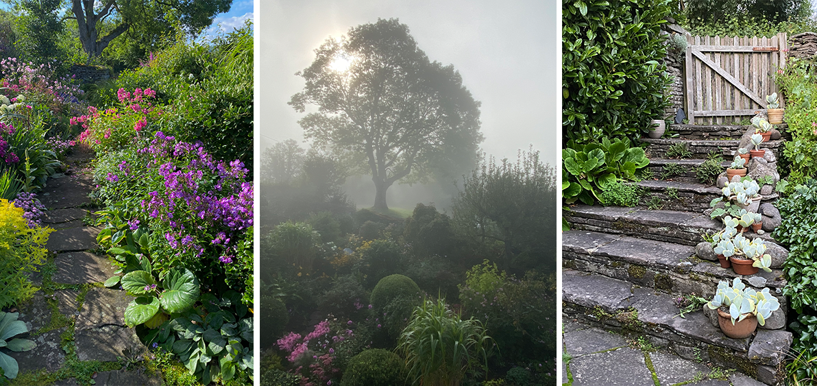 This enclosed flower garden is a lush mix of modern and traditional perennials interspersed with clipped evergreens. Specialities include ferns, succulents and South African plants. There are simple green terraces retained by sculpted hedges offering valley and mountain views. The garden is full of scented shrubs, bulbs and meadow grass adjoin a small orchard and a magical, steep 15 acre, riverside oak woodland, maintained for its carpet of mosses.