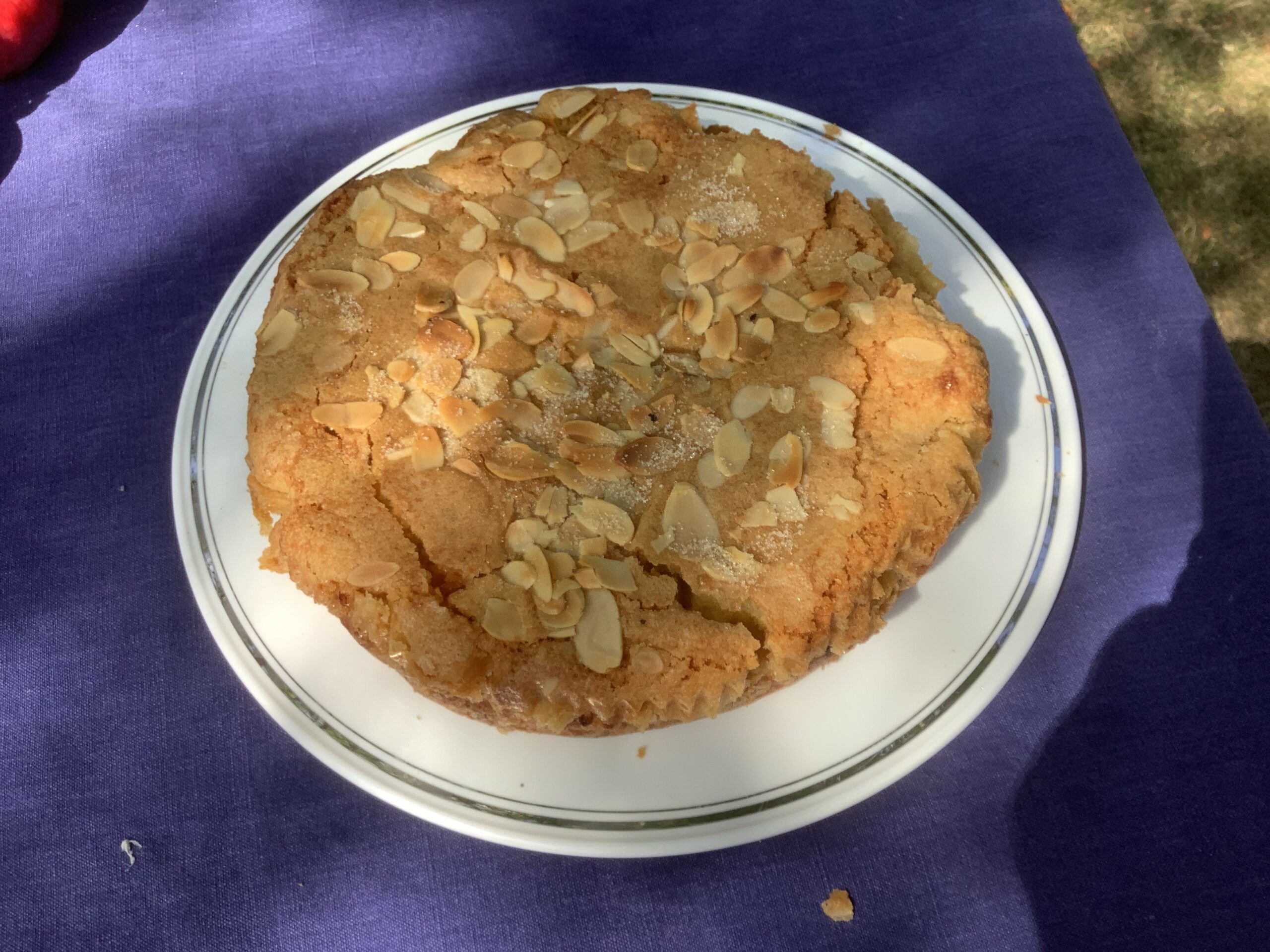 - Sprinkle flaked almonds mixed with Demerara sugar on top of cake.