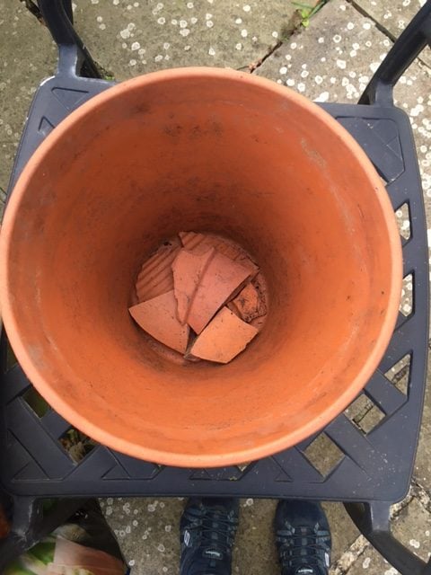 Fill the bottom of the pot with crocks / broken pot fragments.