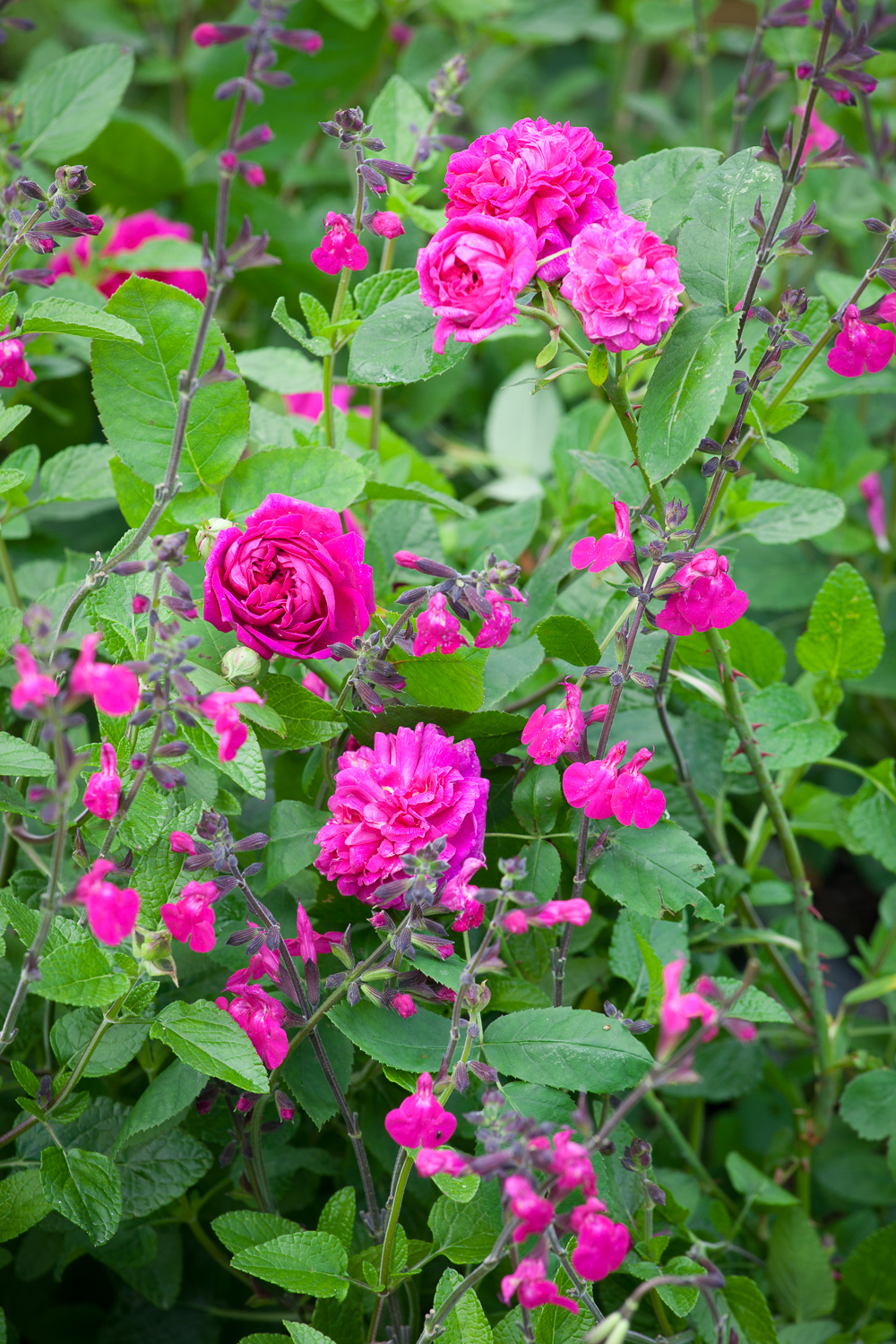 - Rose de Rescht (Shrub Rose) syn. R. ‘De Resht’ with Salvia microphylla ‘Cerro Potosí’ (Baby sage)
