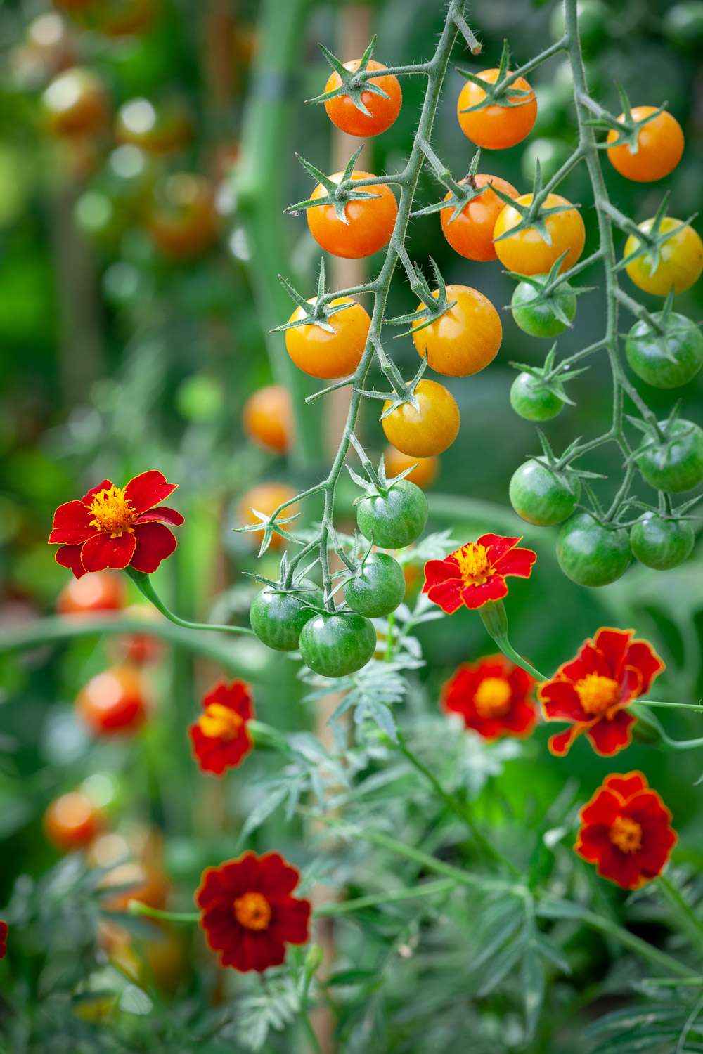 Companion planting of tomatoes with Tagetes tenuifolia ‘Tangering Gem’ and ‘Lemon Gem’ in the greenhouse at Perch Hill. Marigolds