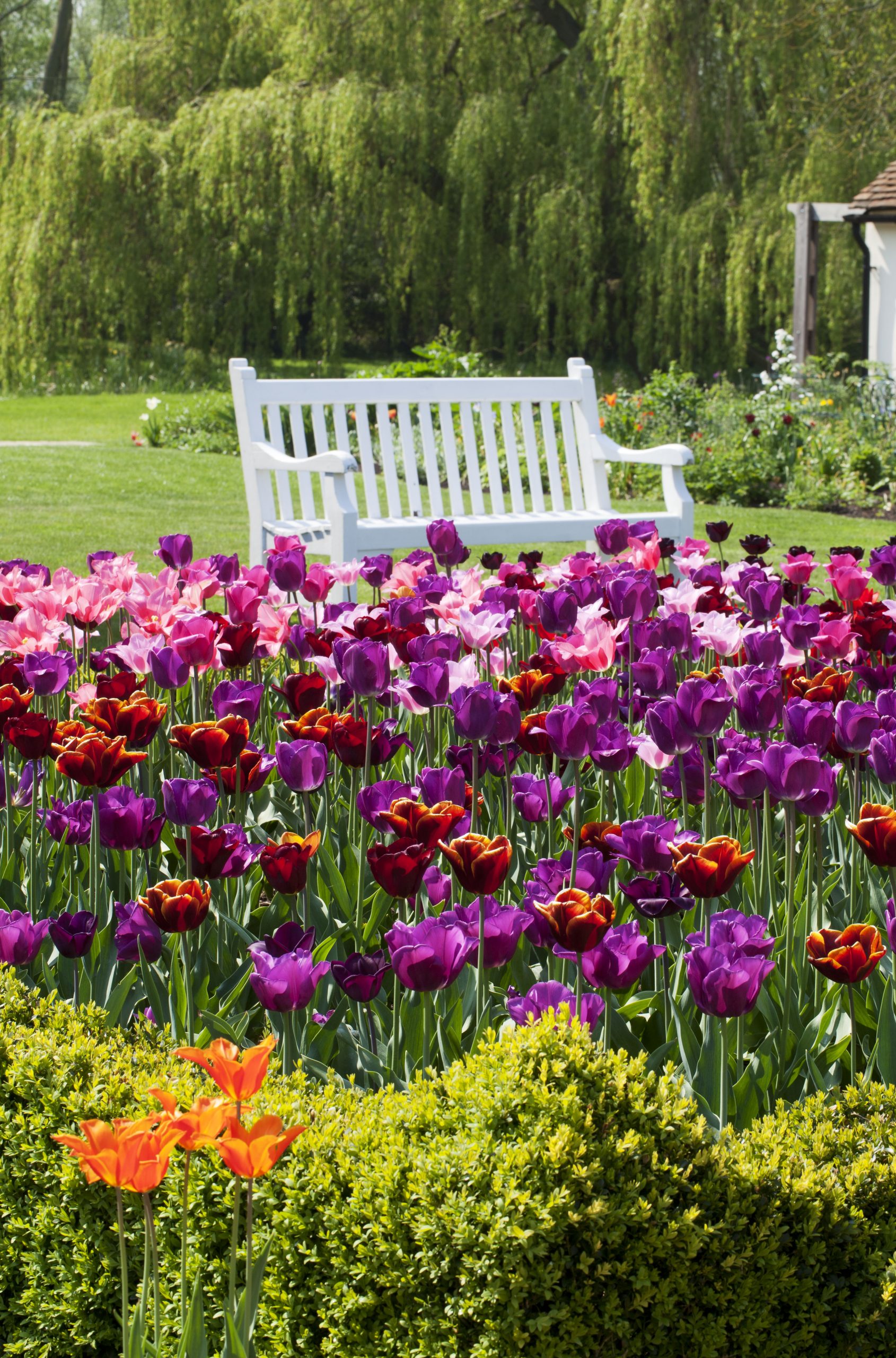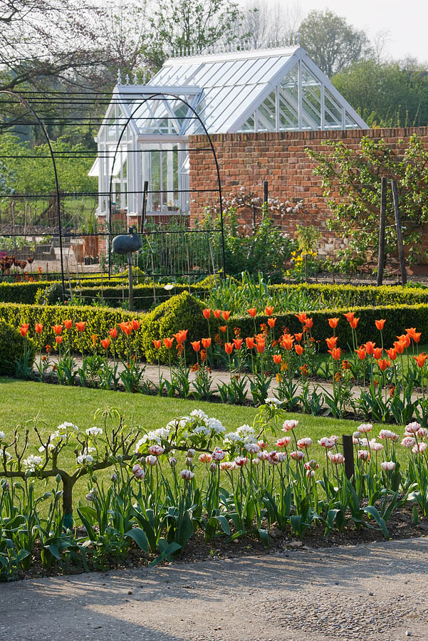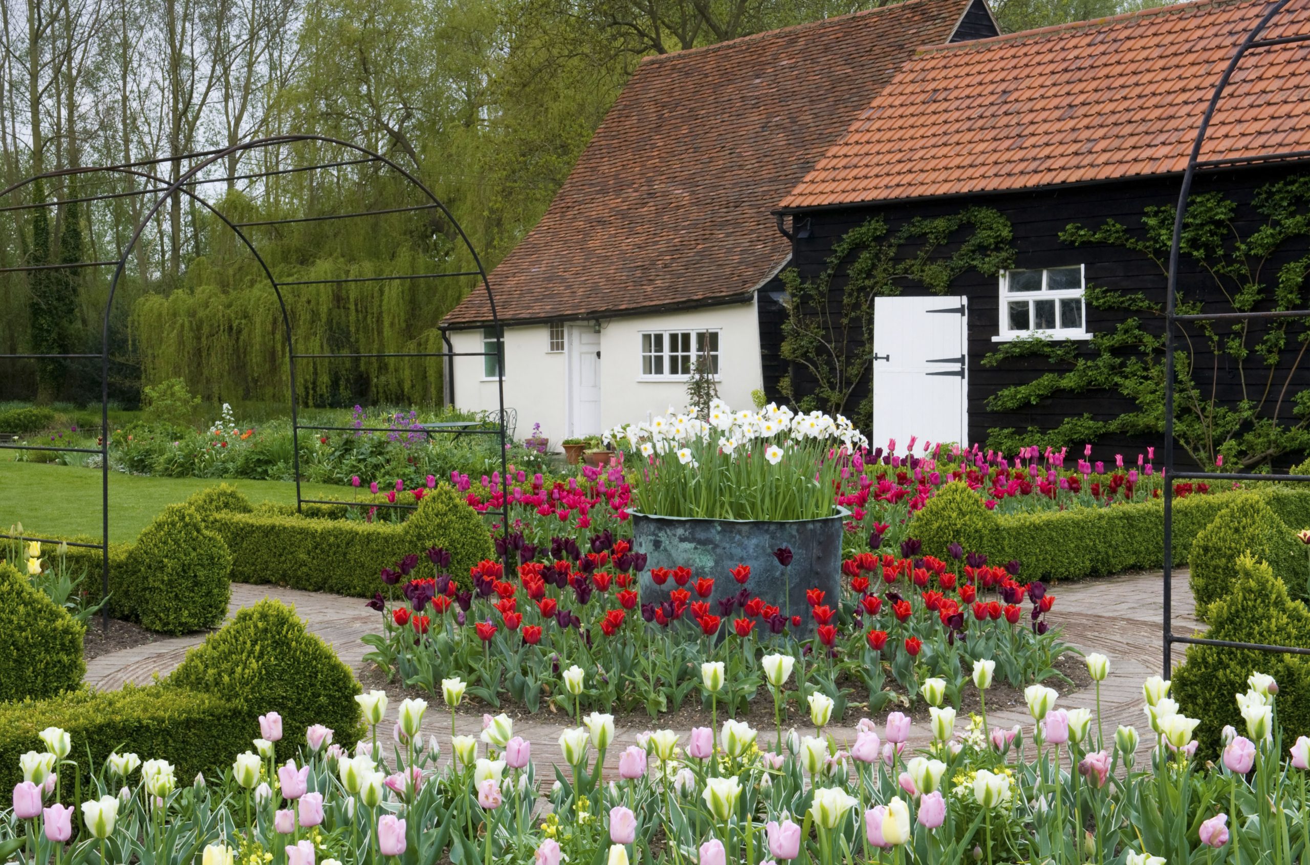 The reputation of Philippa Burrough’s stunning Essex garden grows from year to year; recently it was voted one of the country’s top 100 gardens to visit by Garden News magazine. Hardly surprising giving the ravishing plant combinations she arranges in the different beds and borders which have the mellow house and farm buildings as their picturesque backdrop. In particular, at this time of year the listed black barns enclose a stunning display of tulips in the old farmyard that is colour coordinated, skilfully mixed with perennials and neatly enclosed with low clipped hedging.