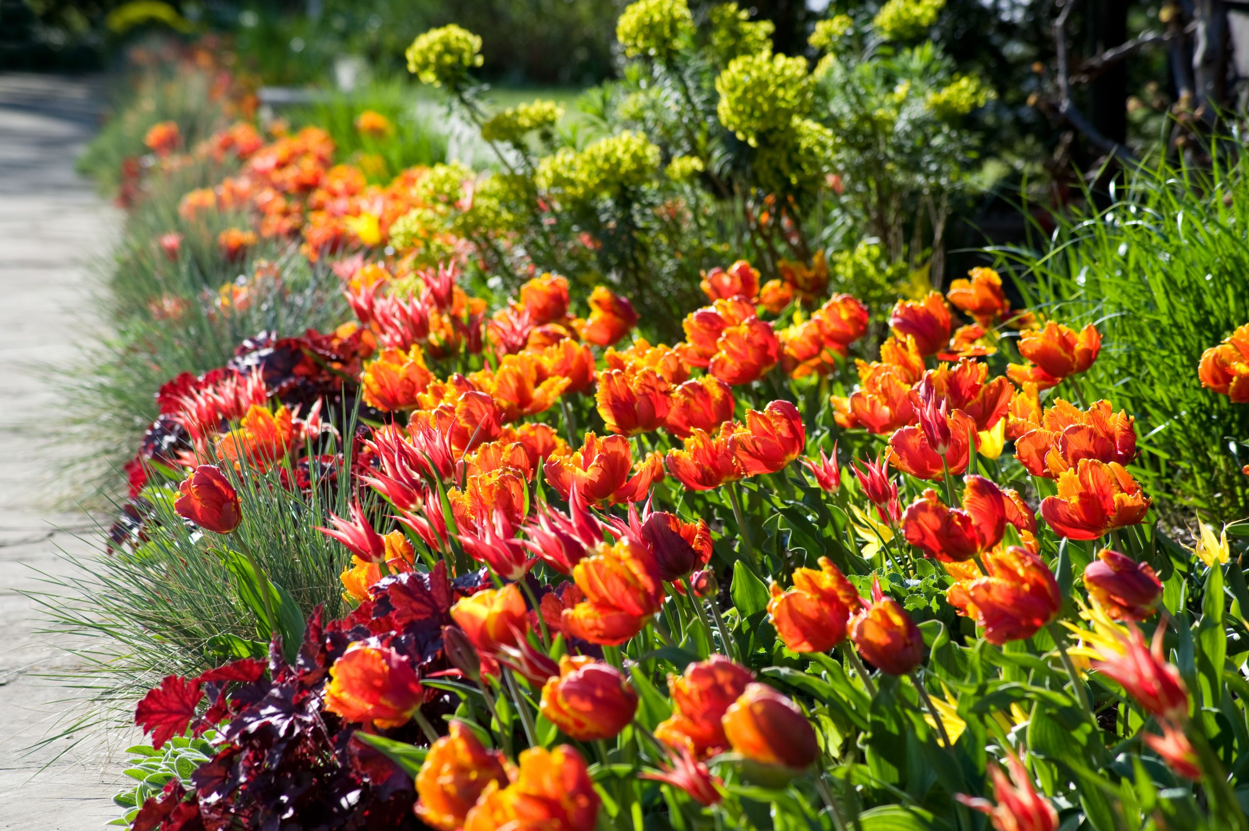 The tulips are planted in their thousands every year in November and December and their display is followed later in the summer by a bravura array of tender exotics and a colourful late-summer climax of dahlias. But as well as the seasonal theatre, this is a garden of great balance, its form provided by the arrangement of buildings and clipped beech hedges, and its contents also including carefully arranged herbaceous borders and a gentle arrangement of drought-tolerant perennials and mini-annuals scattered through the meadow.