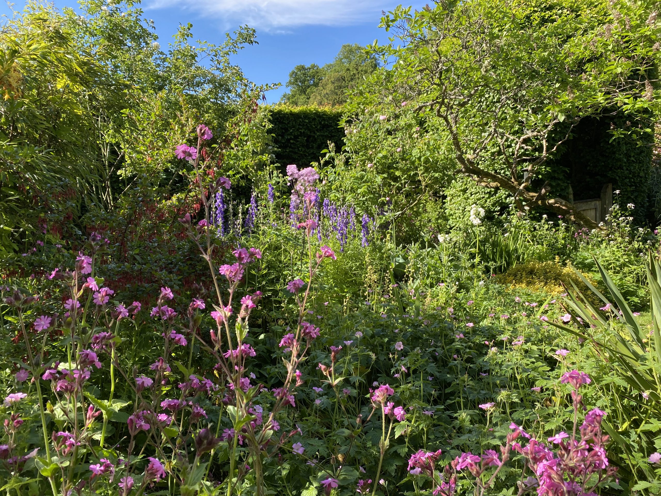 A stream runs through the garden from the north, enclosed by large yew hedges (1909) recently reduced in width. Originally planted as a rose garden the depredations of the wild deer meant the roses had to be removed and replaced with foliage plants to give year round interest.