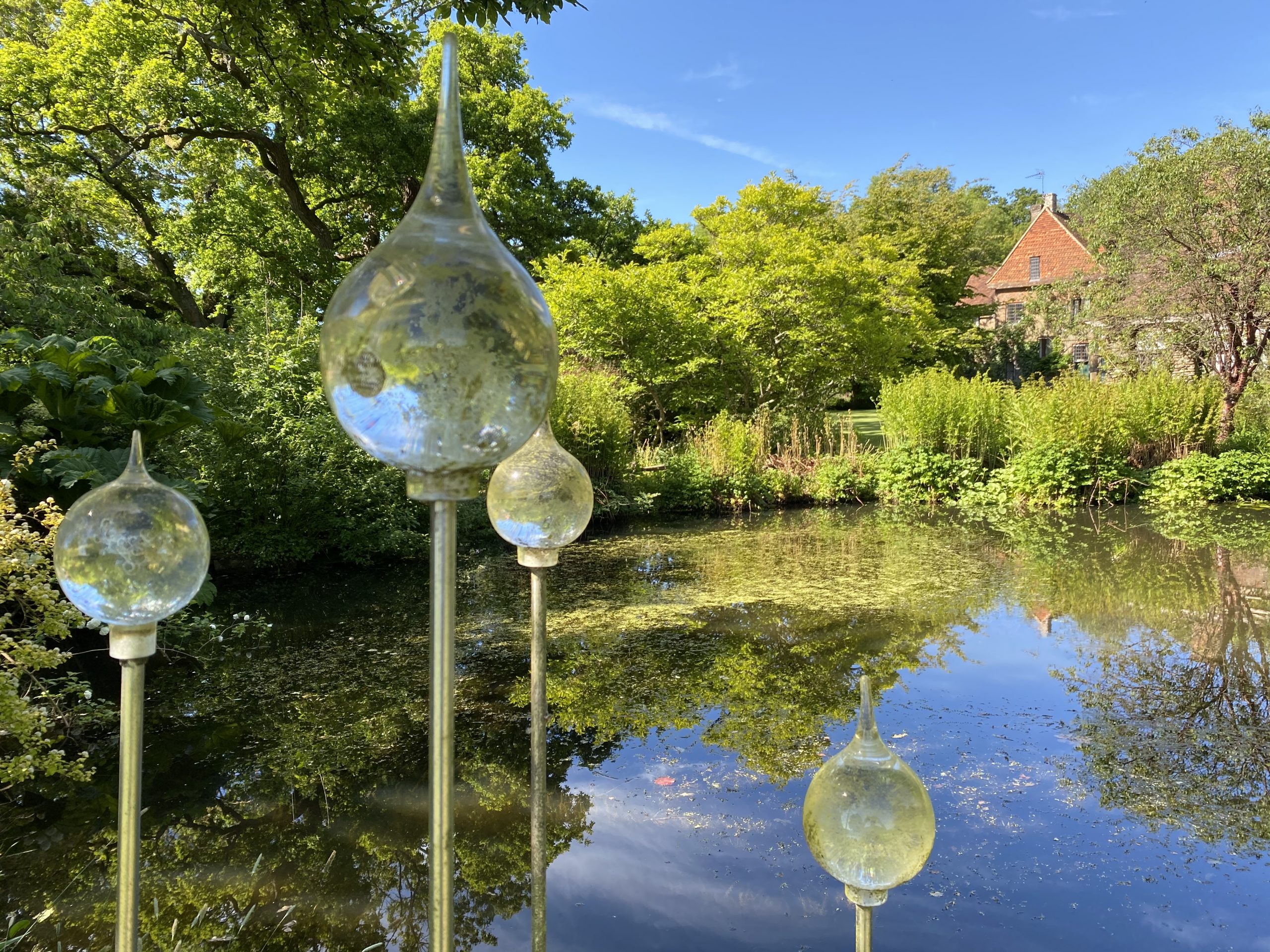 A five acre English heritage Grade II* listed garden which surrounds and complements a historic family home dating from the 16th century, and added to each century since, giving a series of garden rooms of great variety, from the formal old “cottage garden” at the front, with delightfully informal planting, continuing south past a hedge of sweet smelling azalea pontica, to a robust pergola of Bargate stone by W.D.Caröe, leading to the enlarged field pond, recently dredged. W.D. was Martin Caroe’s grandfather, he and his wife were friends with their Surrey neighbour, Gertrude Jekyll.