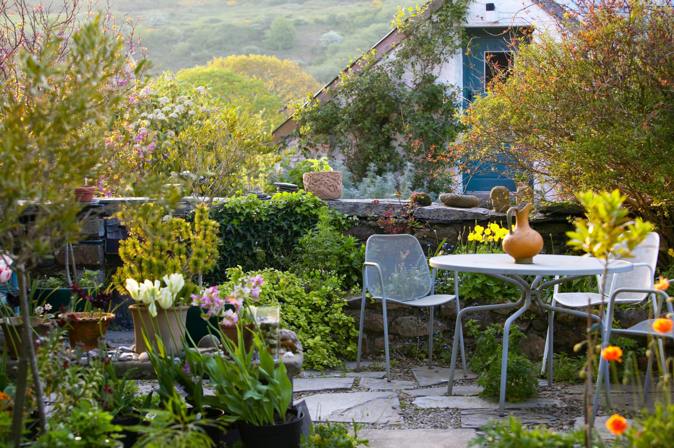Magical 6 acre garden, evolving from wilderness and ancient rocky landscape. Distinctively planted areas leading down to marsh and woodland, against backdrop of the Preseli Mountains.