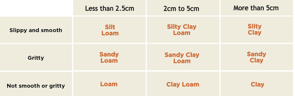 If the soil has formed a sausage shape, how long is it and how does it feel? See the chart below: