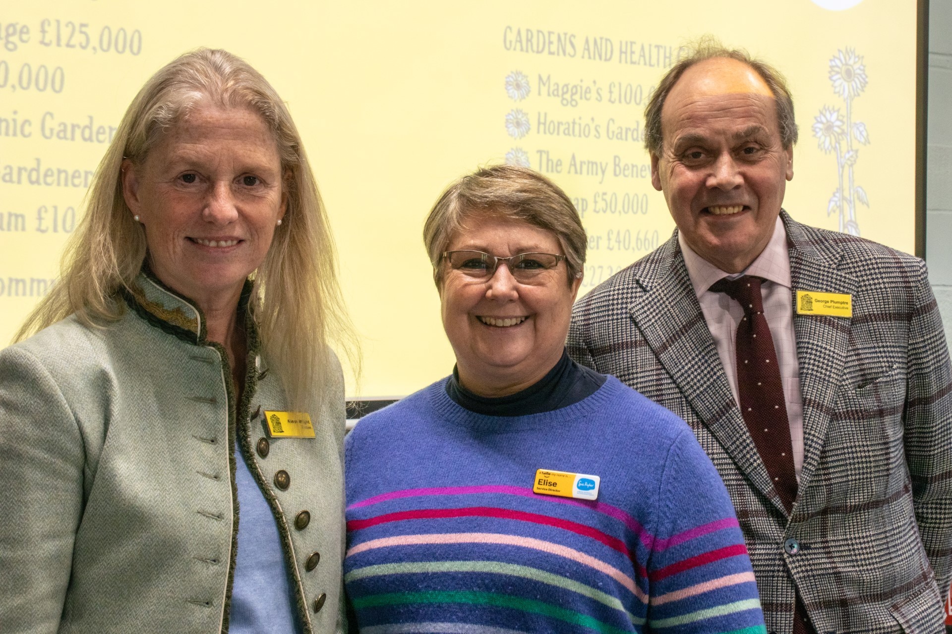 - National Garden Scheme Trustee Alison Wright, Elise Hoadley, Service Director at Sue Ryder Leckhampton Court Hospice and National Garden Scheme Chief Executive, George Plumptre