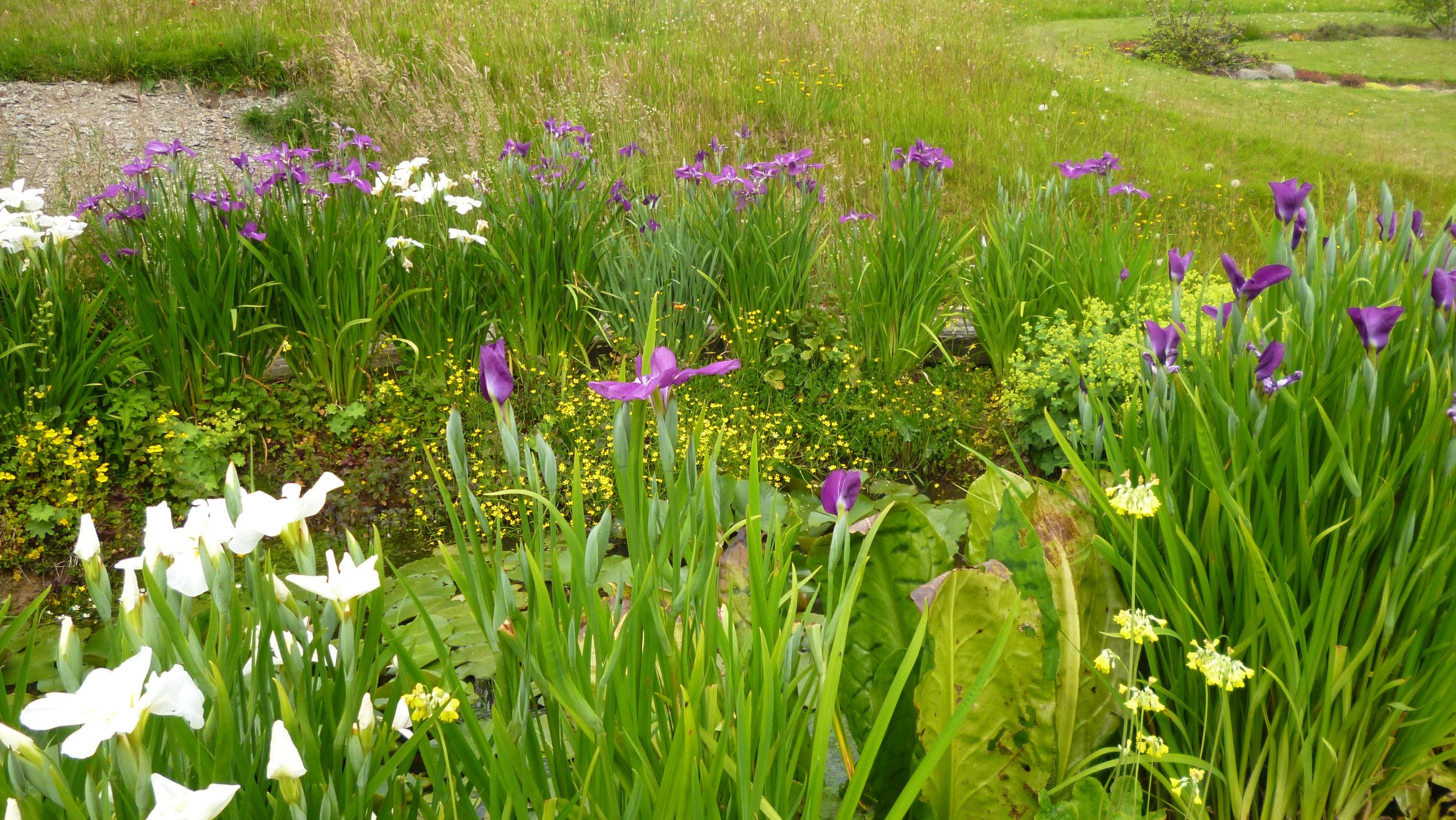 The five ponds are a striking feature of the garden and are planted up with colourful water lilies and surrounded with marginal plants such as candelabra primroses, mimulus and irises. A fishpond provides a home for goldfish, sarasata comets, golden orfe and shubunkin. Wide mown paths weave between areas of flowery wild meadow with a steadily increasing number of hay field species.