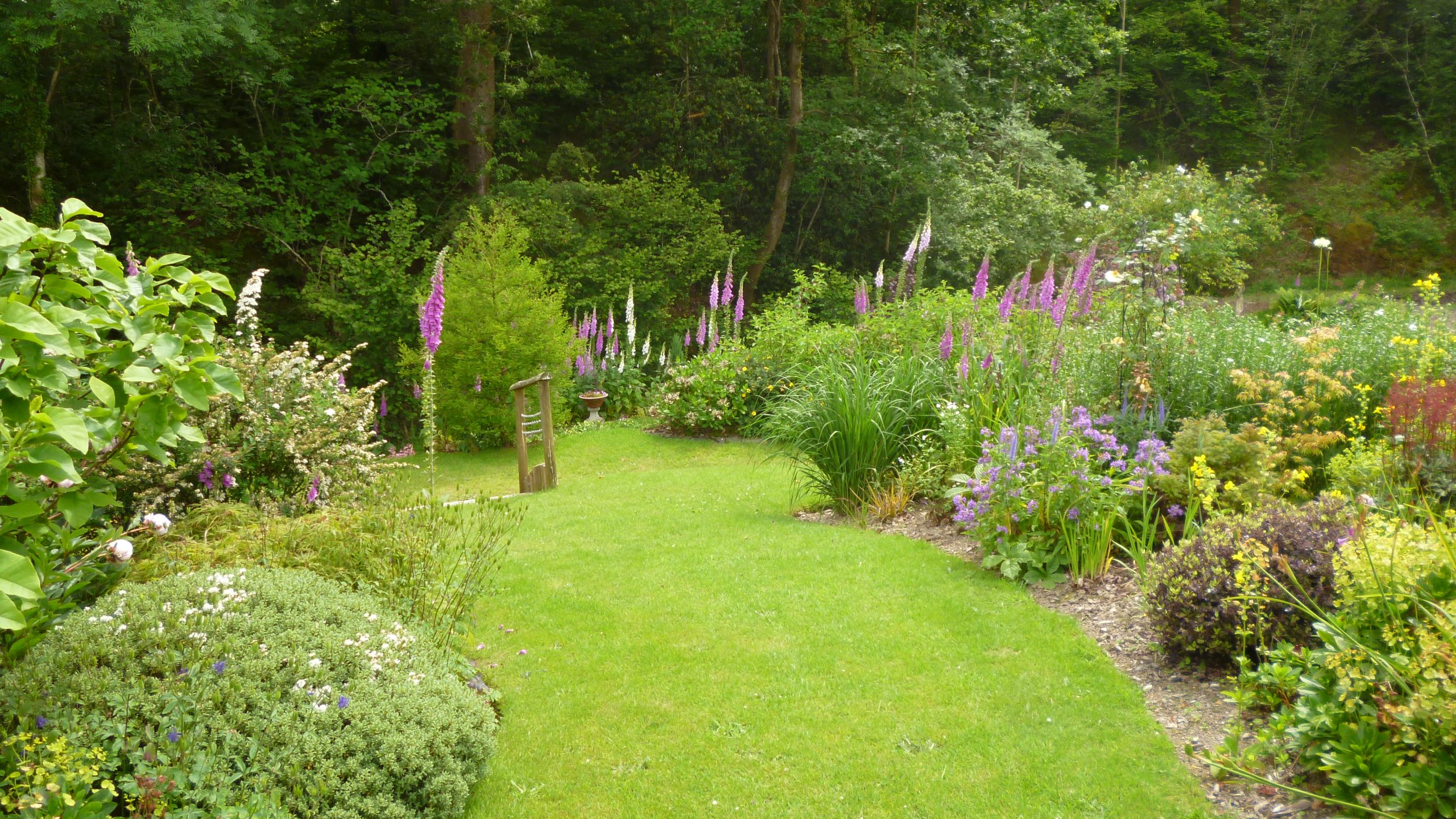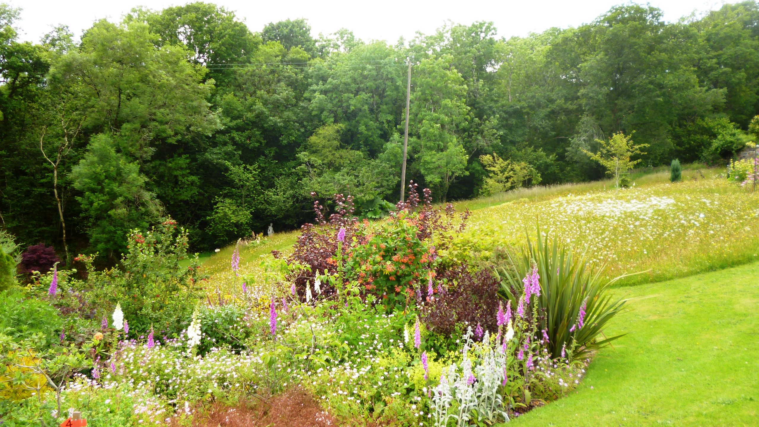 The garden extends to just over an acre and most of it has changed dramatically over the past 10 years when a field of rough pasture was annexed to the original small garden surrounding the house. Around the house are roses climbing up the walls and over an arbour; honeysuckles; hostas and fruit trees, including a medlar and a quince and low dry-stone walls provide the perfect niche for succulent plants such as sedums and saxifrages.